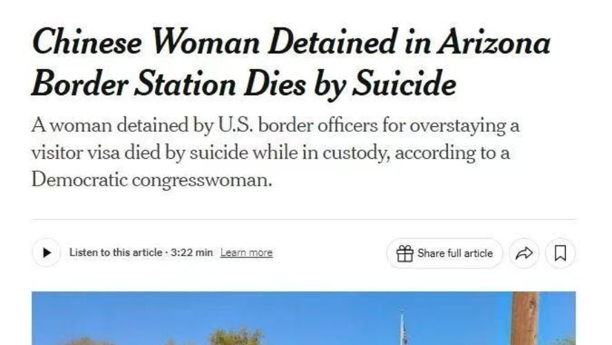 【本报讯】早前我们报道过一名52岁的中国女子,疑似因为签证过期、逾期居留运输22万美元现金被拦检后,关入移民监狱后自杀身亡。(详情点击:一名中国女子在尤马边境巡逻队拘留期间自杀身亡)