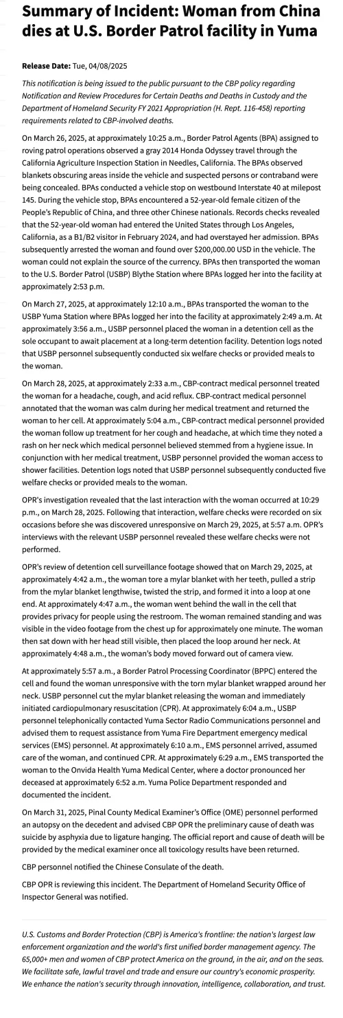 针对这一悲剧事件,美国海关与边境保护局称已向中国驻美领事馆通报相关情况。美国海关与边境保护局监察长办公室及国土安全部监察长办公室正对该事件进行全面审查,以确保调查透明和公正。
