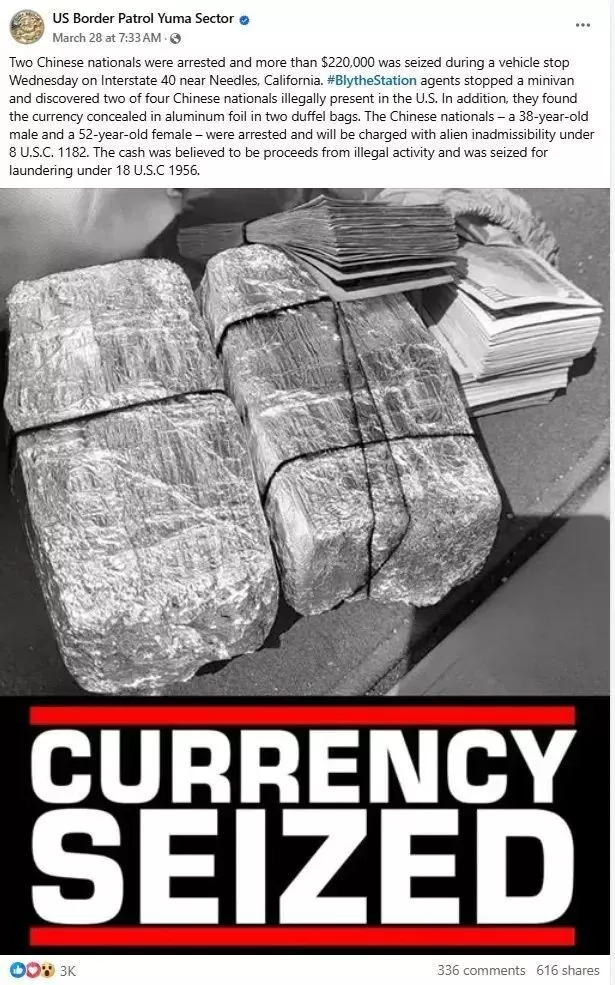 在检查过程中,BPA发现车内共有四名中国公民,其中包括一名52岁的女性公民。经过记录检查,这名女子于2024年2月以B1/B2访客身份合法进入美国,但入境后已逾期居留,被当场拘捕。同时,巡逻人员在车内发现超过20万美元现金,而该女子无法对这笔现金的来源做出合理解释。