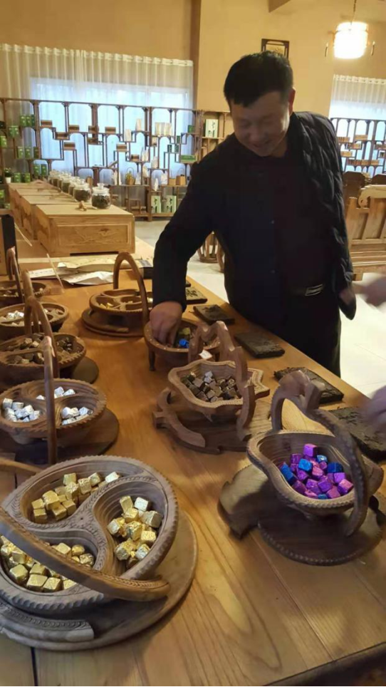 陆靖正在介绍不同口味的小方块黑茶。(邹德浩摄)