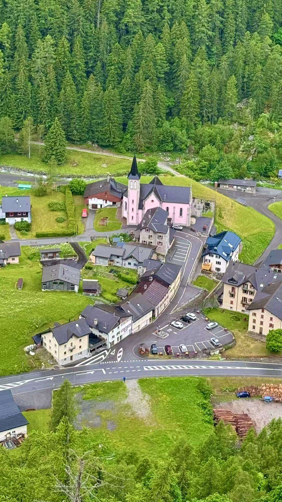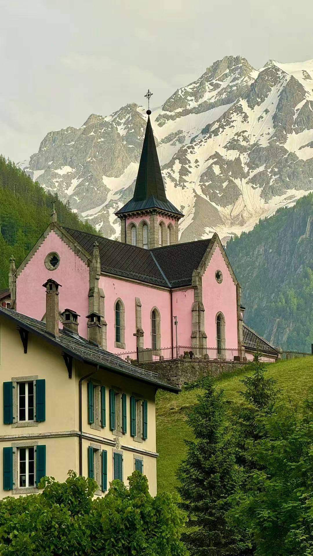 看到粉色小教堂,就抵达了安静美丽的特里安小镇,冰川融水的小河流淌过恬静的瑞士小村庄。