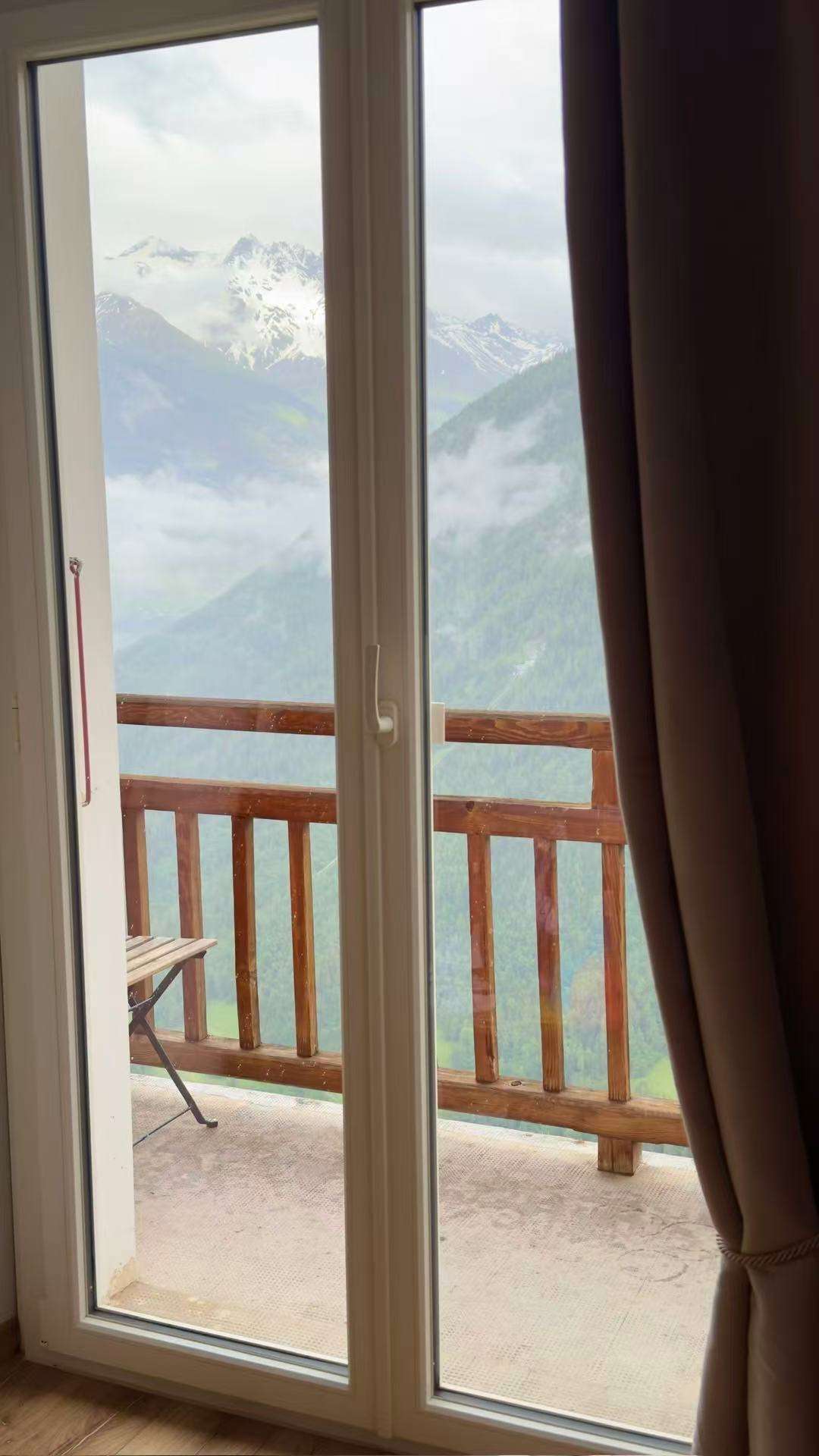 被今晚座落在湖边的旅馆震撼到,推开窗户,远处是连绵的雪山,峰顶覆盖着终年不化的冰川,在阳光下泛着冷冽的蓝白色光芒。
