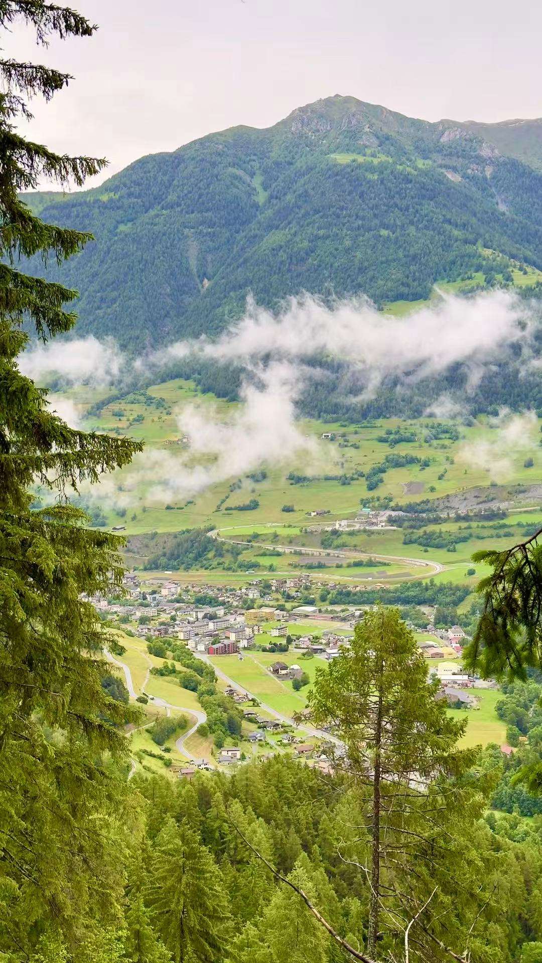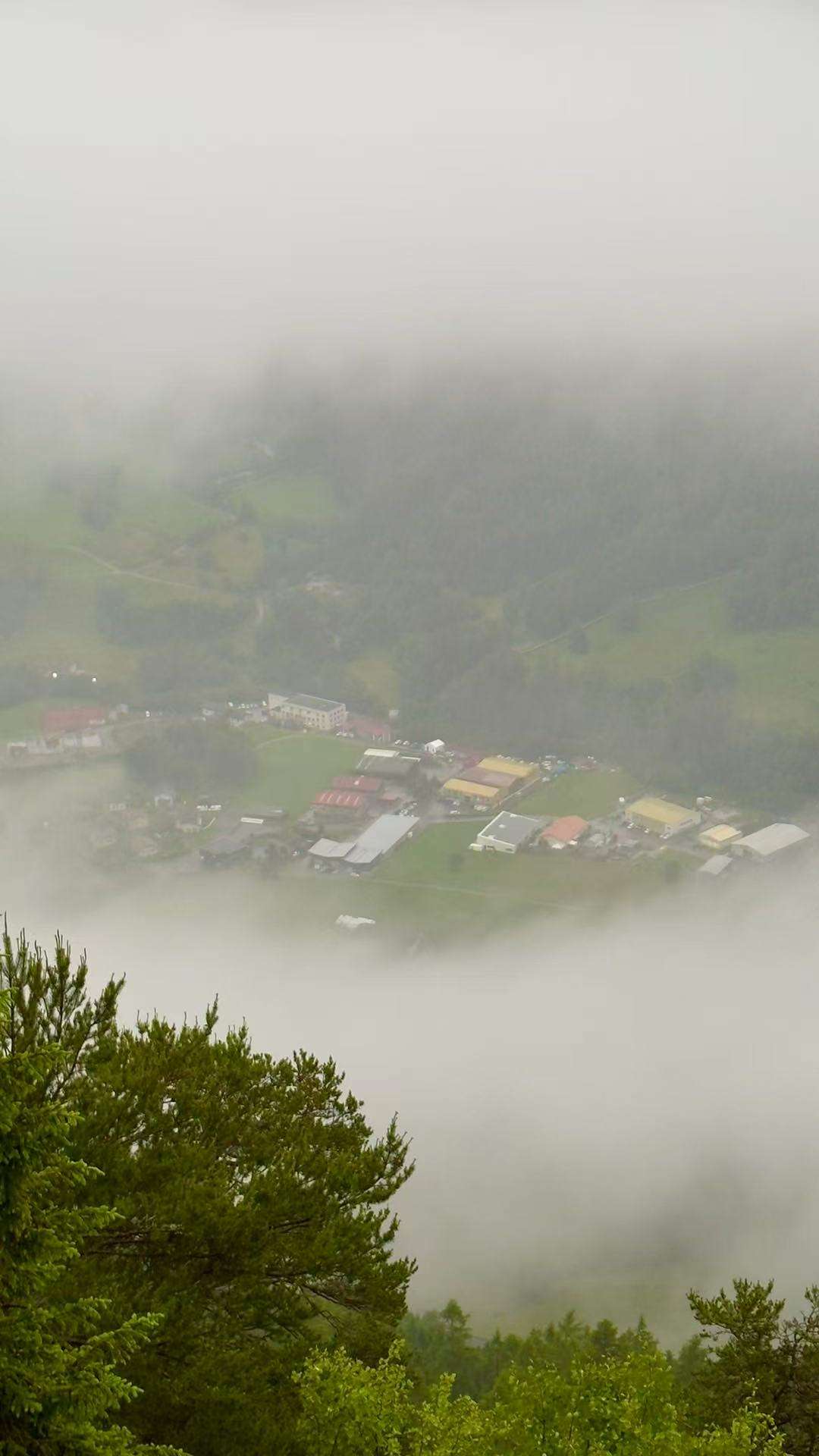 峡谷里的小村庄若隐若现,红瓦木屋错落有致地散布在缓坡上,烟囱里偶尔飘出袅袅炊烟。雾气越来越浓,眼前的世界仿佛被一阵流动的云烟轻轻包裹……