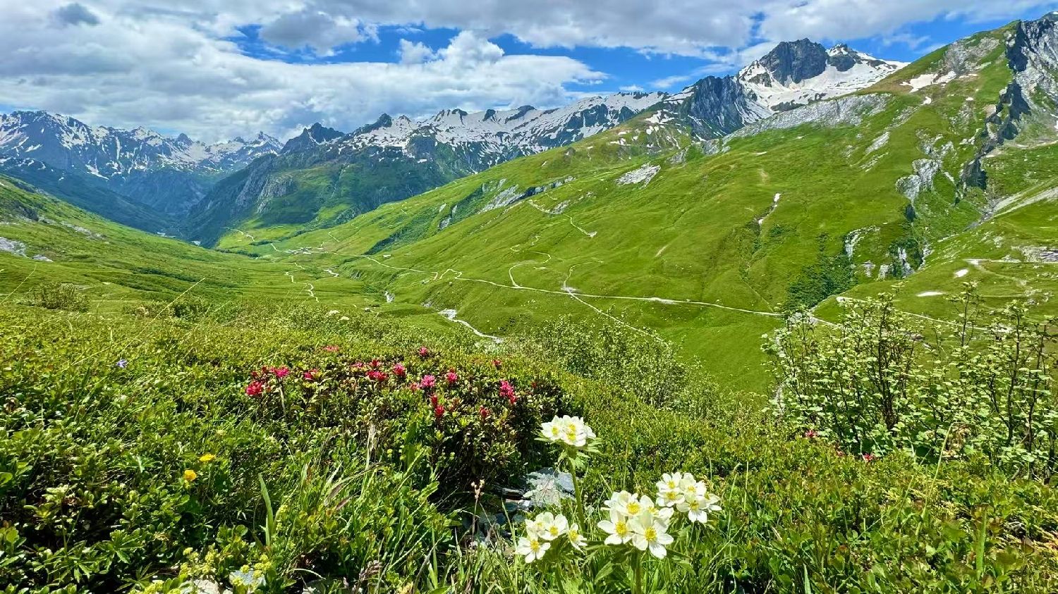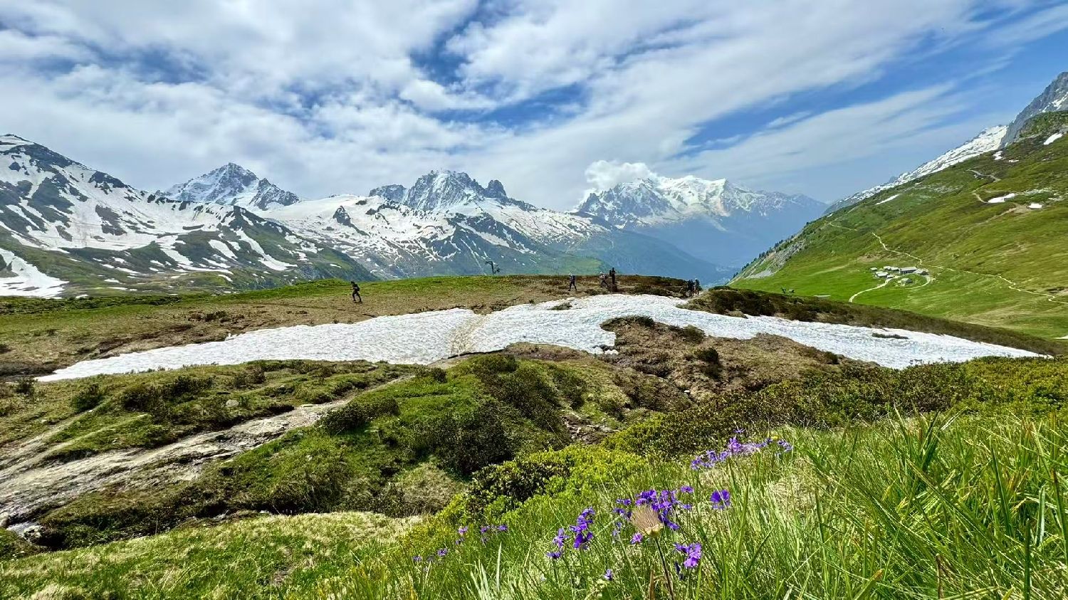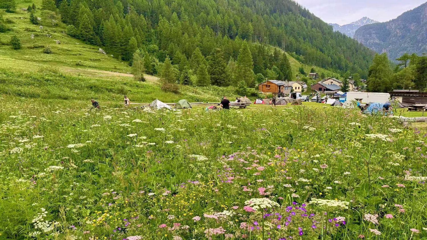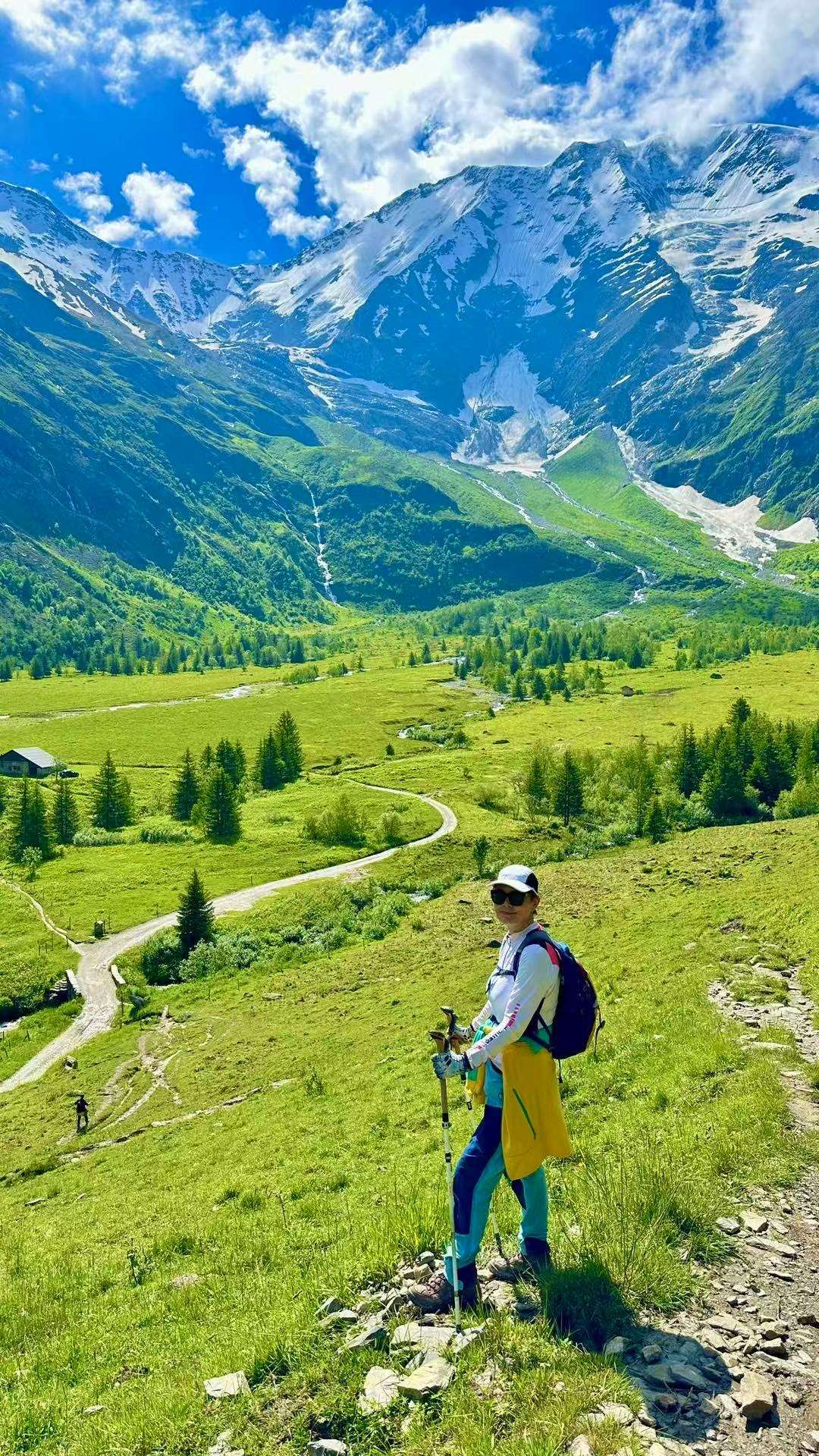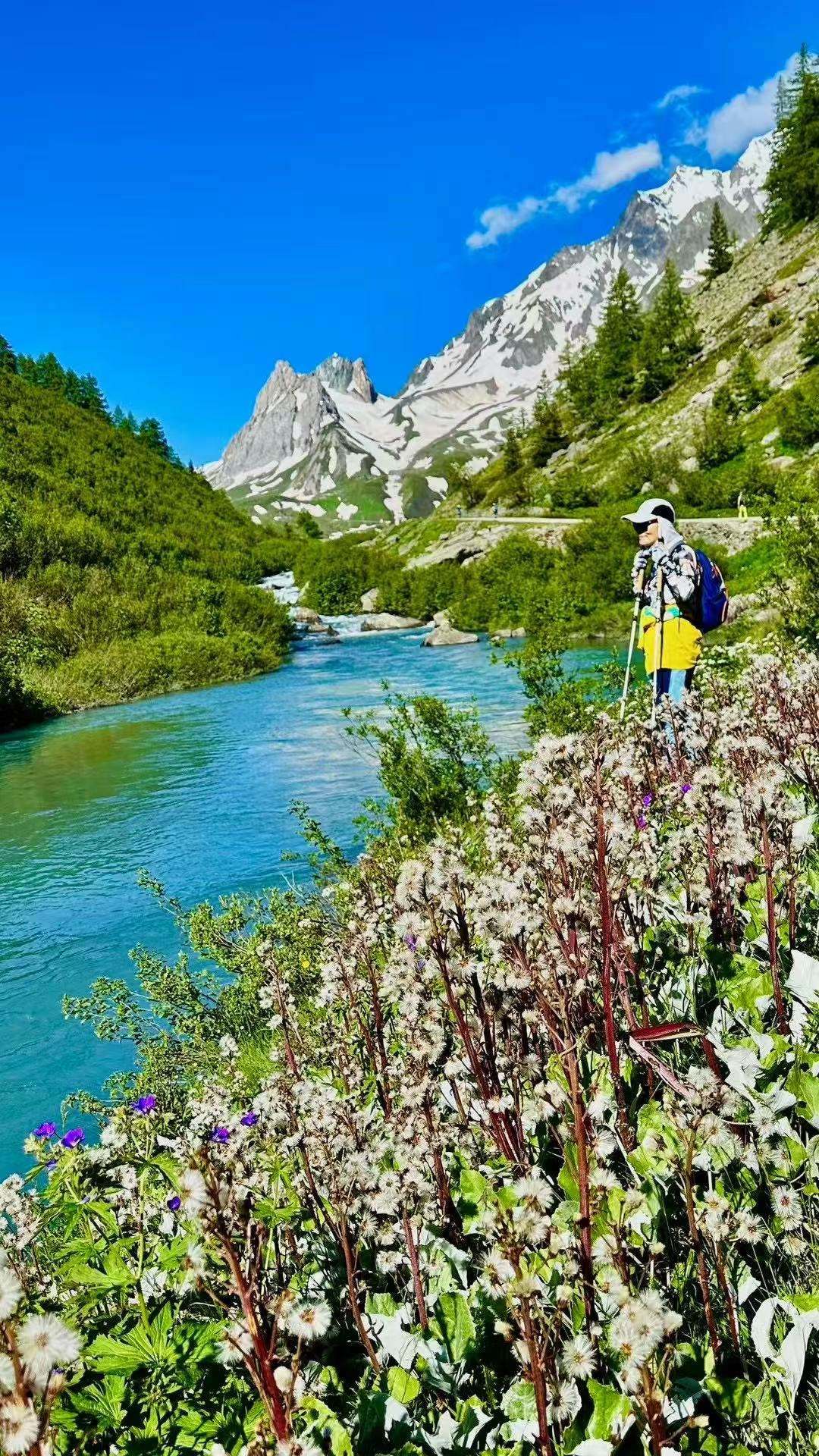 六月的勃朗峰像是一幅刚展开的画卷,花海与阳光温柔交汇。山谷中溪流潺潺,水声伴着鸟鸣,队友们陶醉于满山遍野、五彩缤纷的野花丛中。