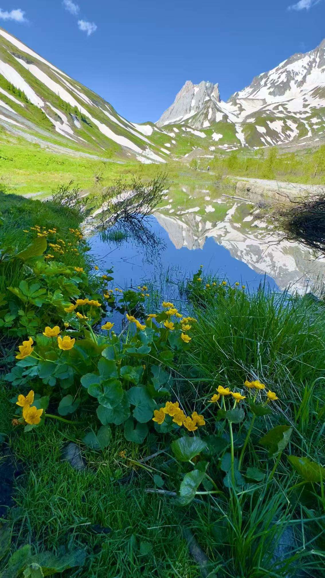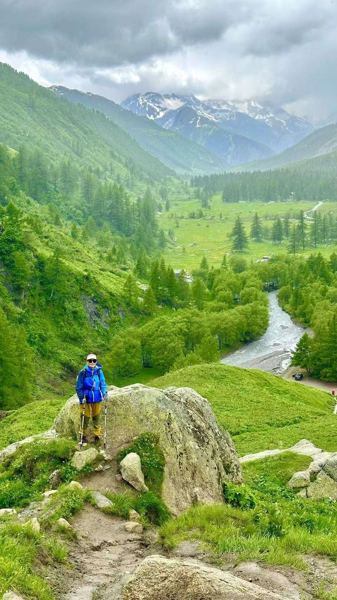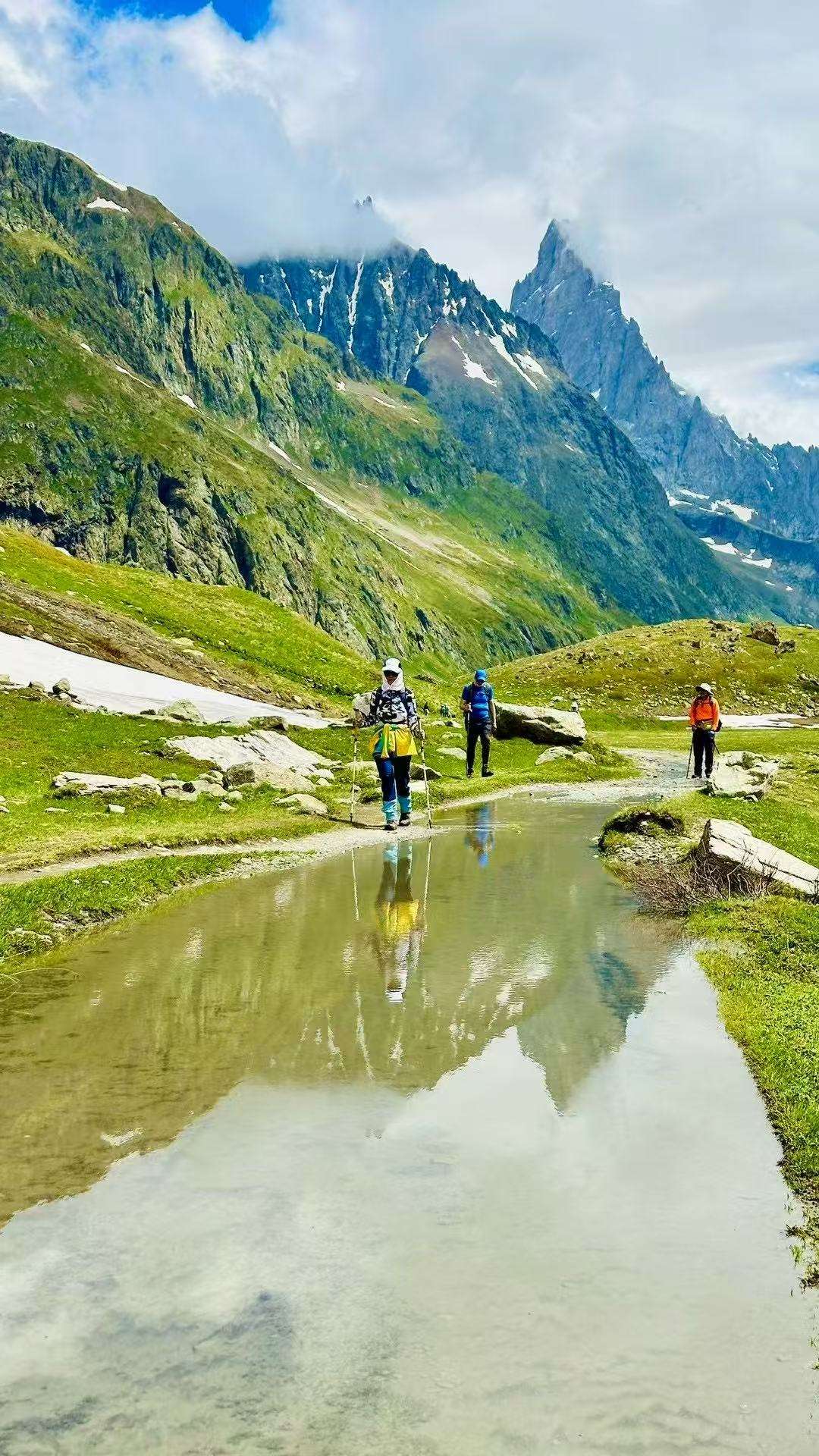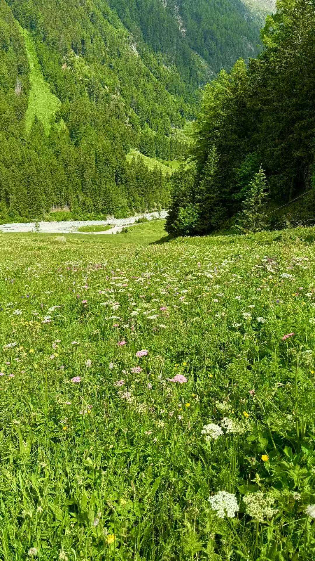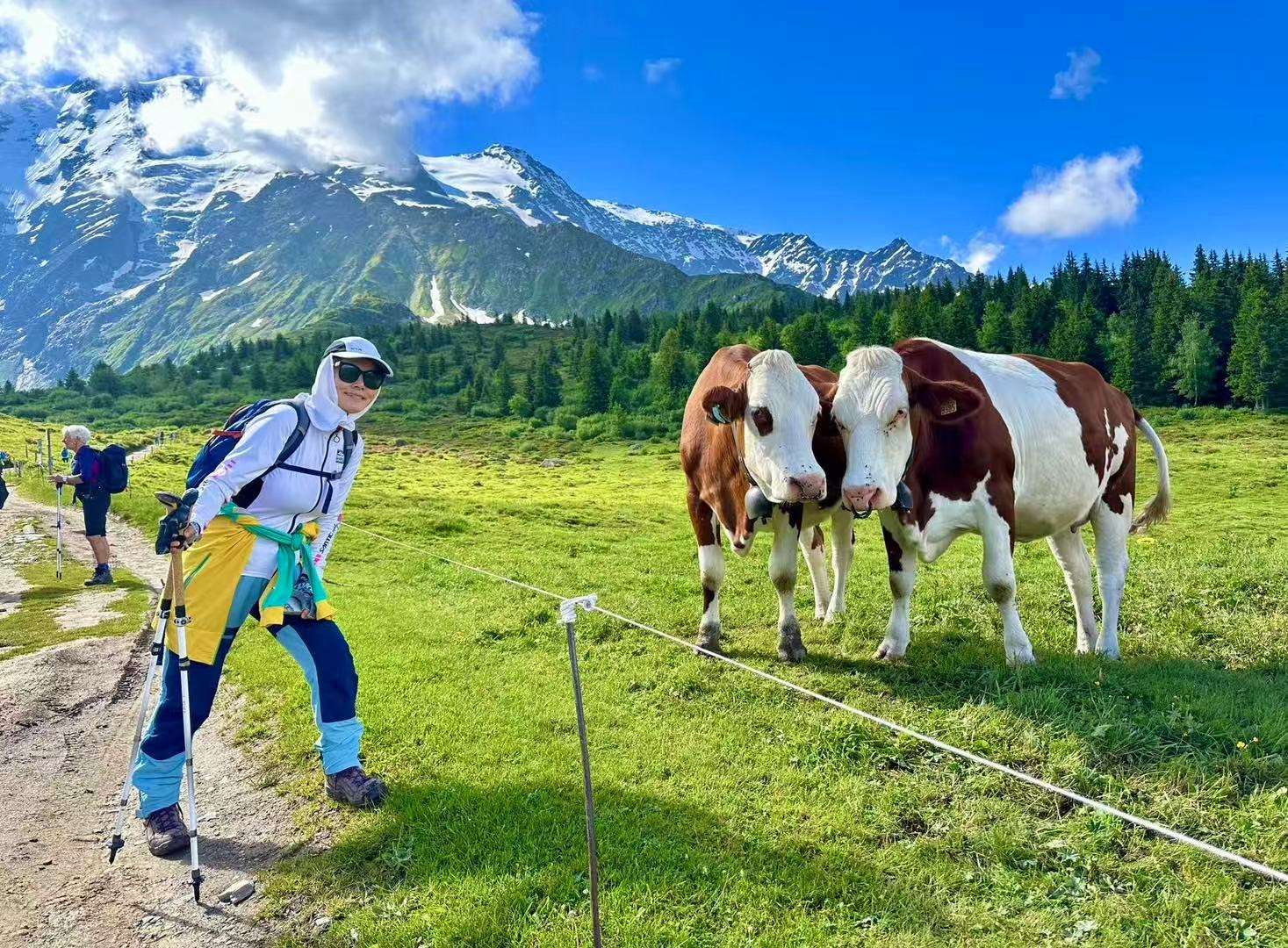 六月的勃朗峰像是一幅刚展开的画卷,花海与阳光温柔交汇。山谷中溪流潺潺,水声伴着鸟鸣,队友们陶醉于满山遍野、五彩缤纷的野花丛中。