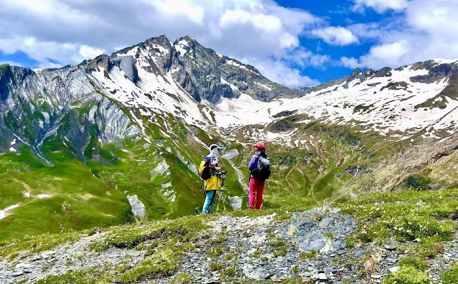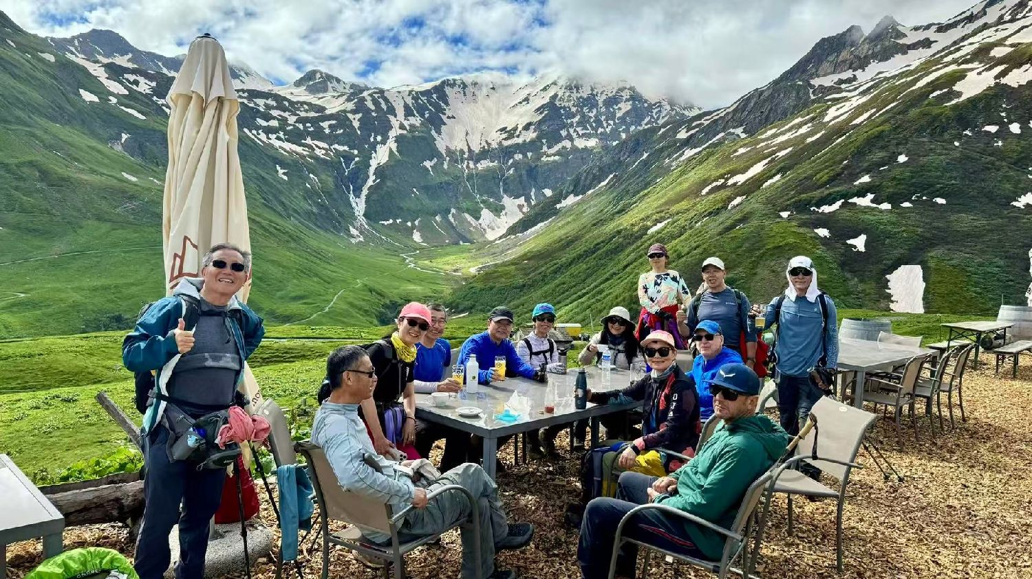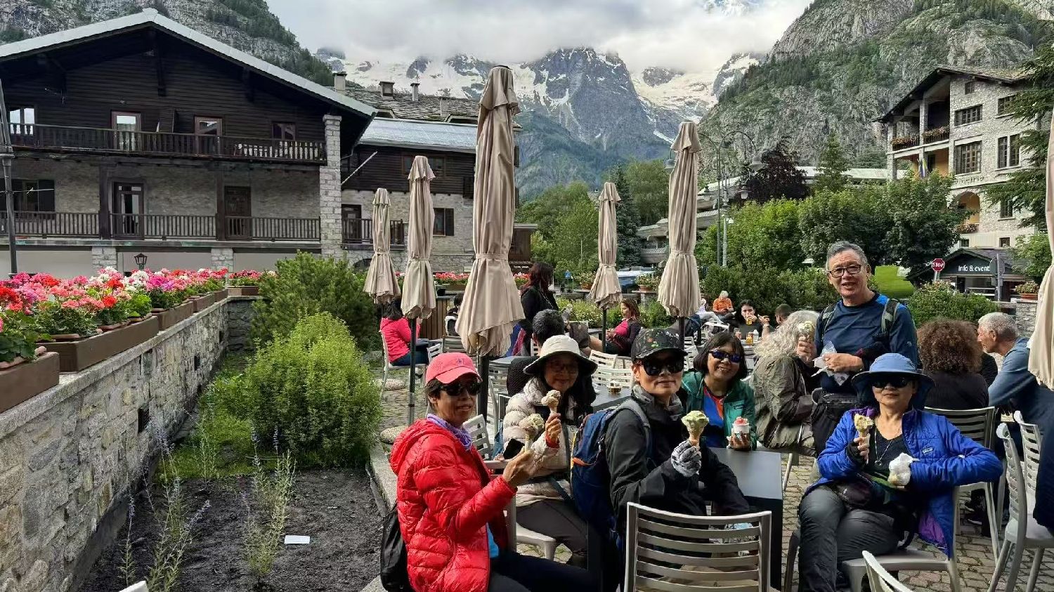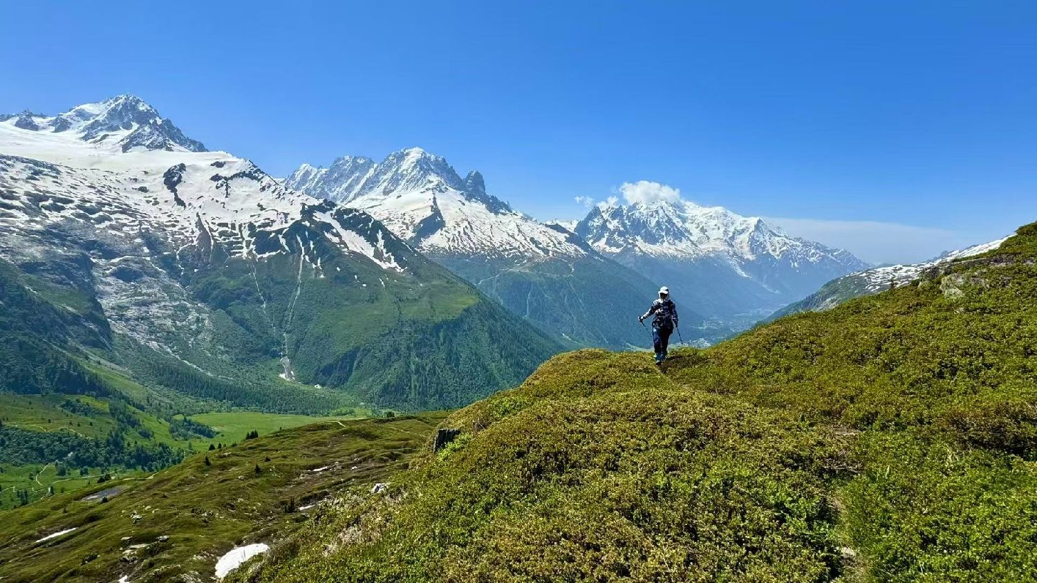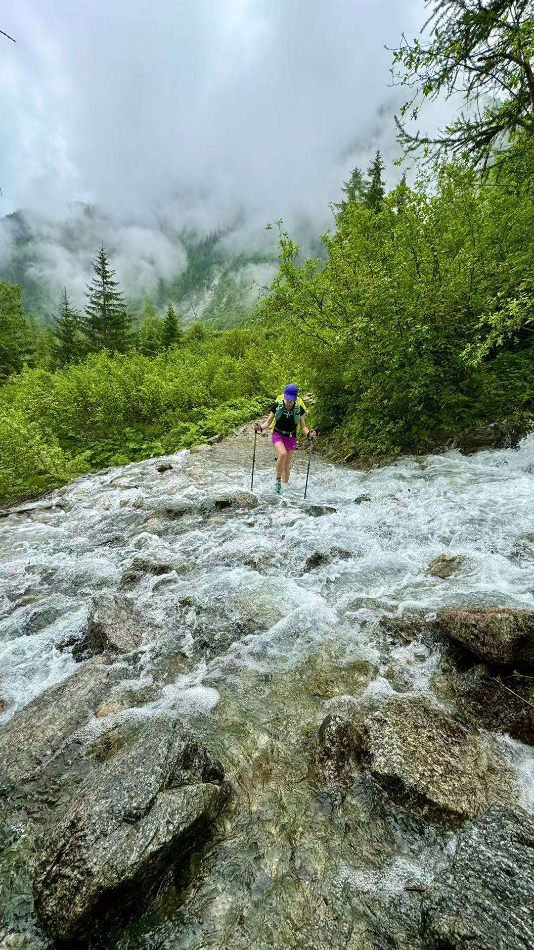 六月的勃朗峰像是一幅刚展开的画卷,花海与阳光温柔交汇。山谷中溪流潺潺,水声伴着鸟鸣,队友们陶醉于满山遍野、五彩缤纷的野花丛中。