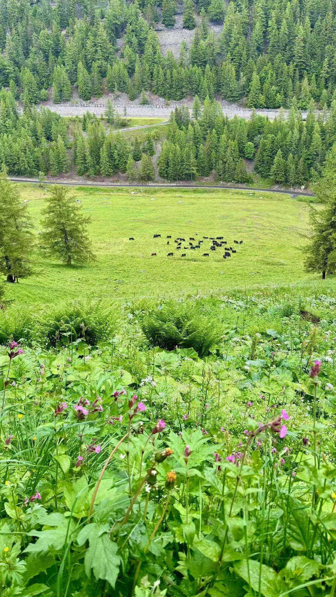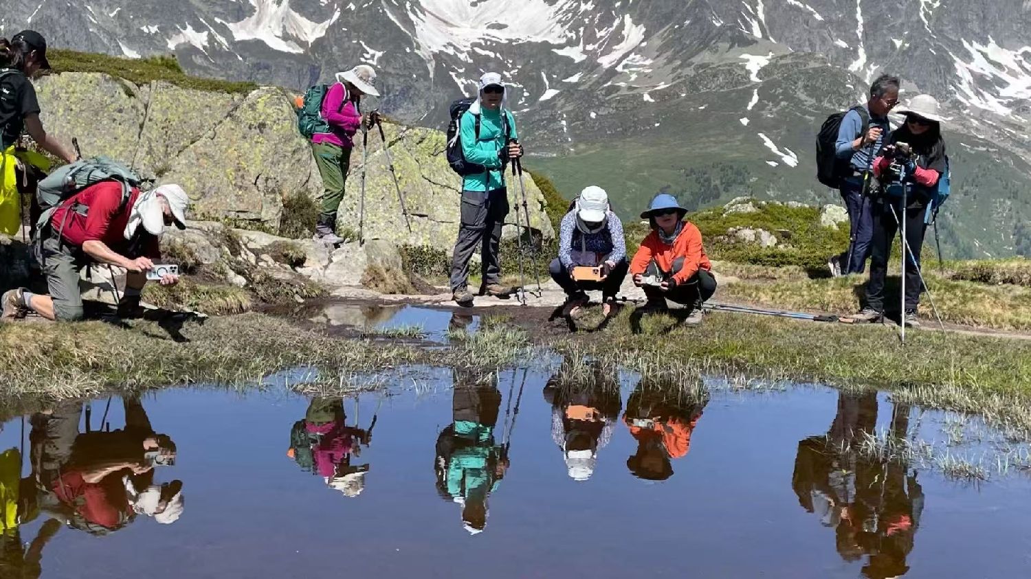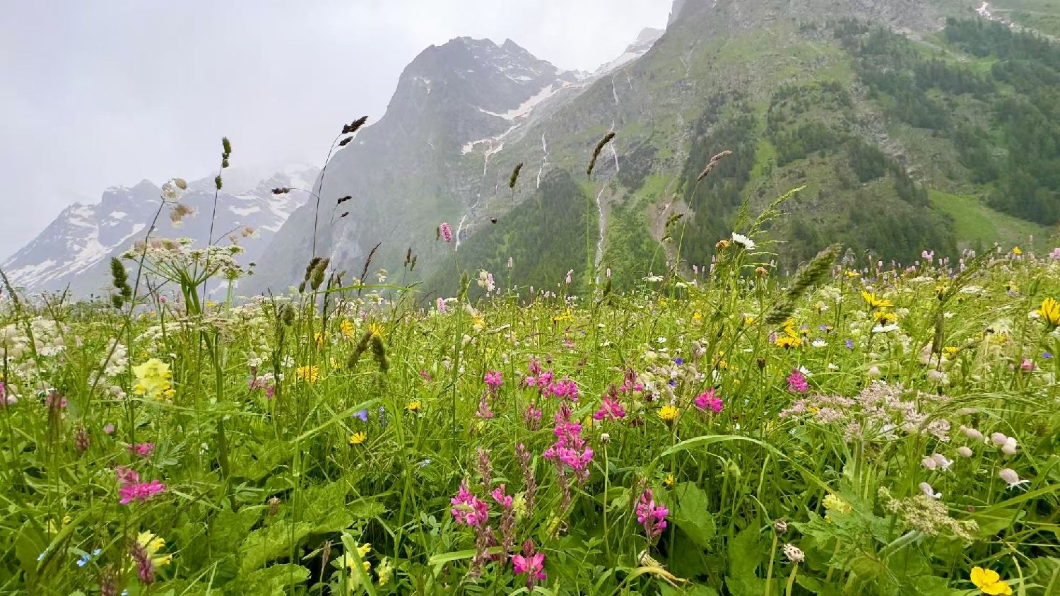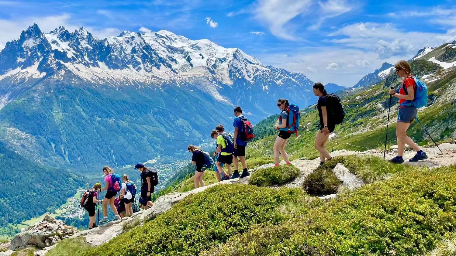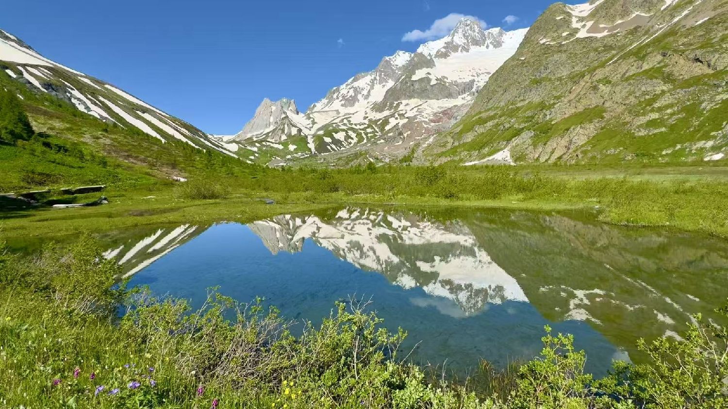 六月的勃朗峰像是一幅刚展开的画卷,花海与阳光温柔交汇。山谷中溪流潺潺,水声伴着鸟鸣,队友们陶醉于满山遍野、五彩缤纷的野花丛中。