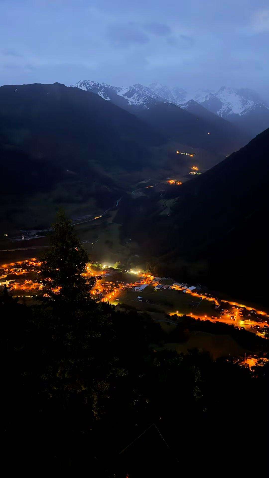 夜已深,雪山在暮色中渐渐隐去轮廓,只剩下模糊的剪影。小村里的灯光次第亮起,暖红色的光点从窗户透出,沿着山坡层层叠叠地蔓延,像是倒映在地面的星空。