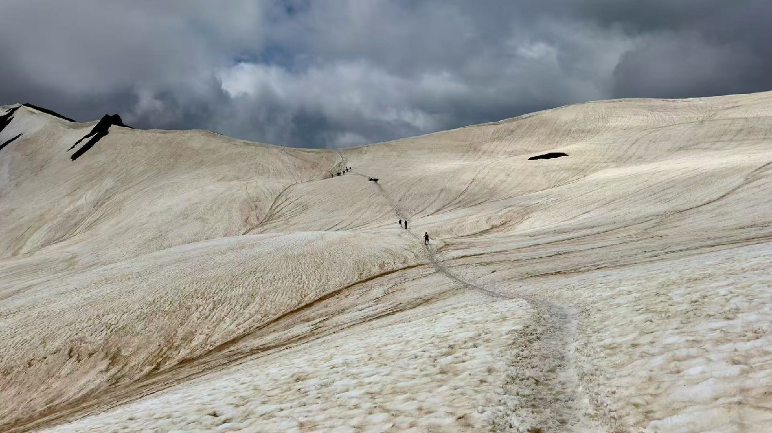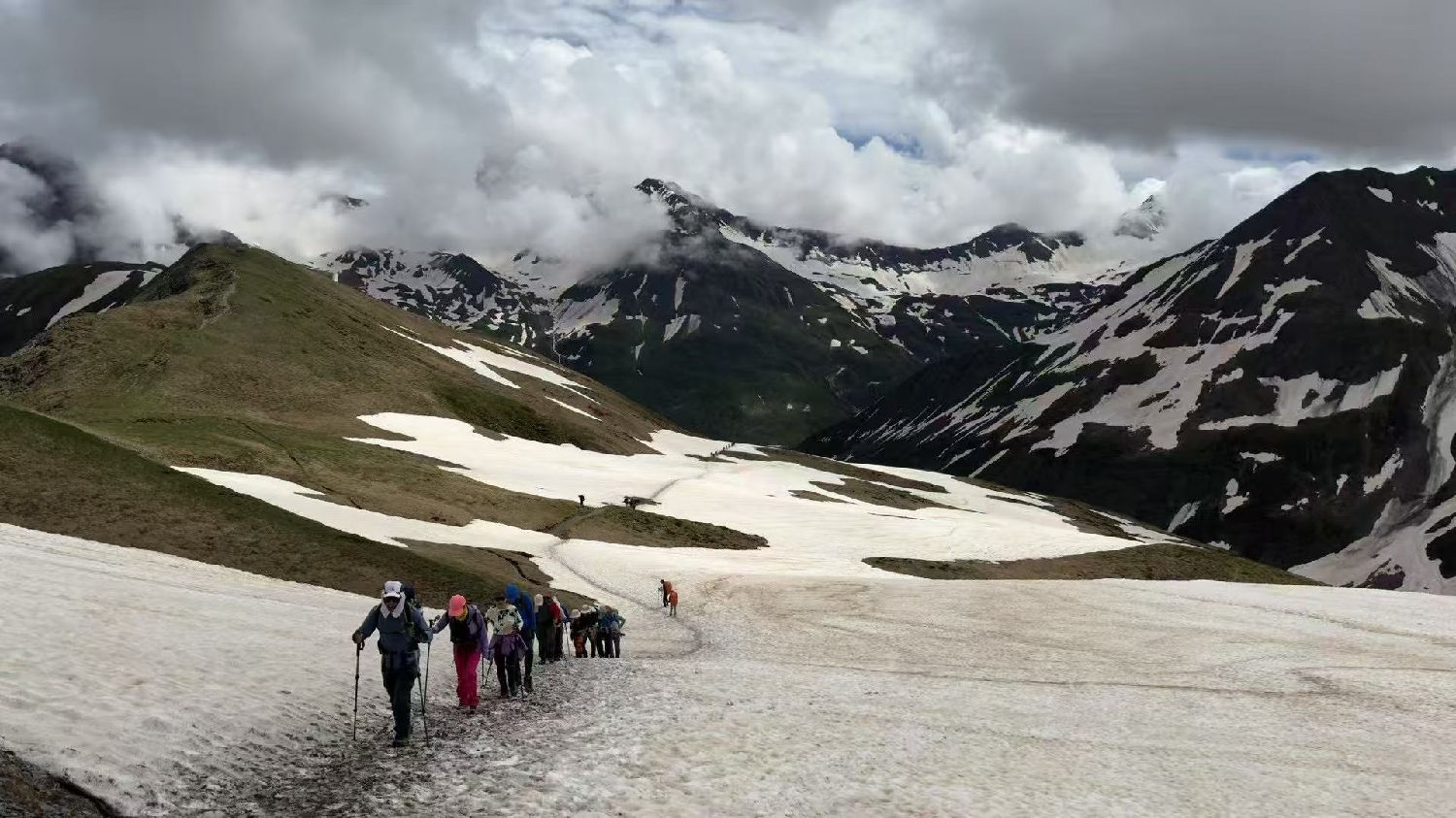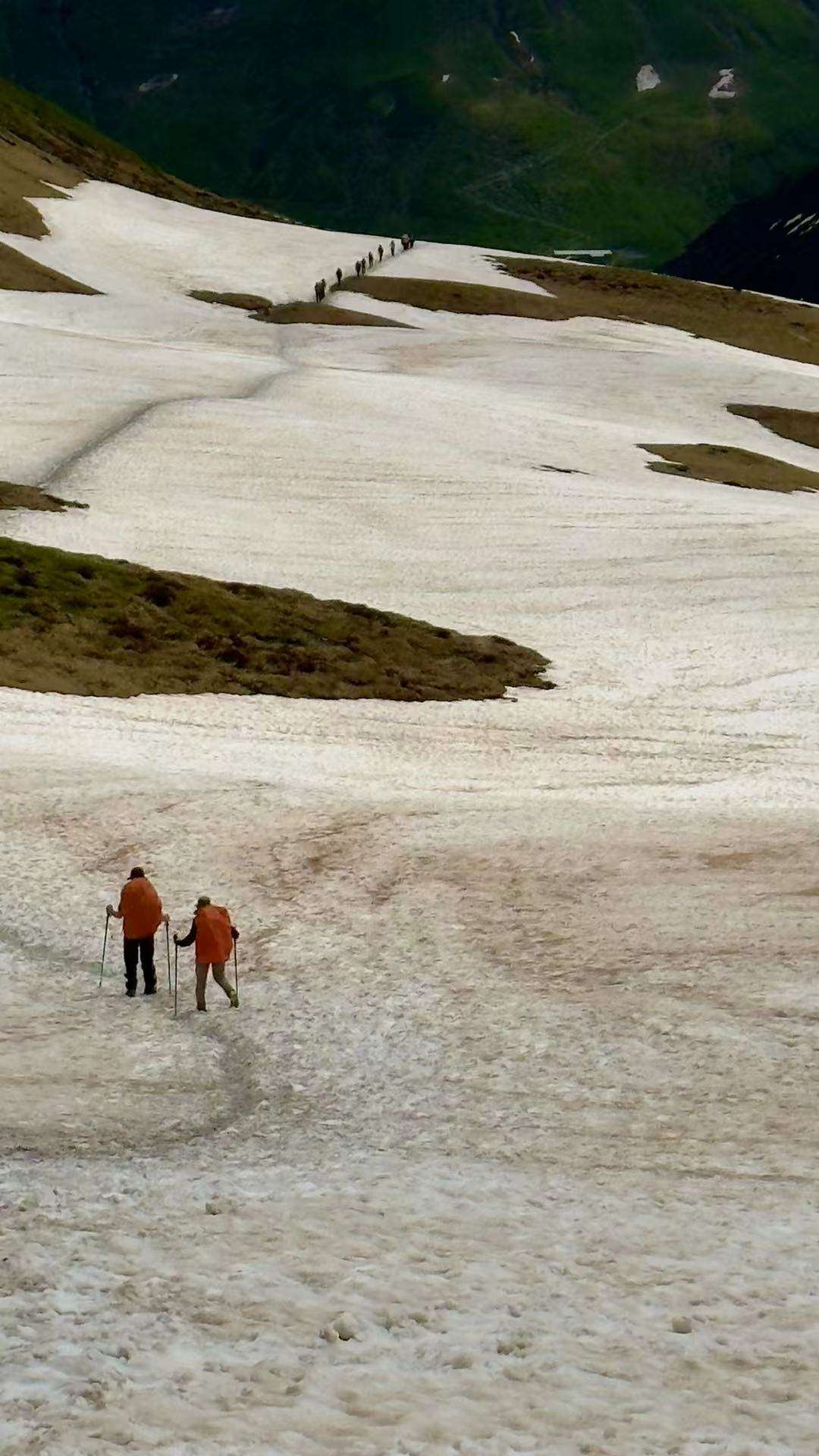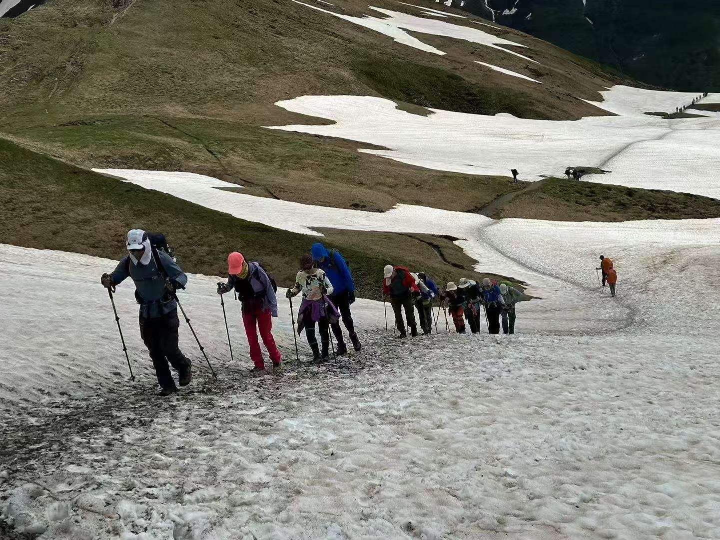 向导法兰克又一次判断失误。爬雪山过雪地,正常操作必须要套上冰爪。不知是否他自己是滑雪教练,技能熟练,翻个雪山小菜一碟,也或许今年是他第一次带队,没有走过这段雪路,低估了山上雪路的危险。他说上坡时不用套冰爪,我们前面几个队友就按他的吩咐没套,后面的队友们没听到,纷纷套上了冰爪。