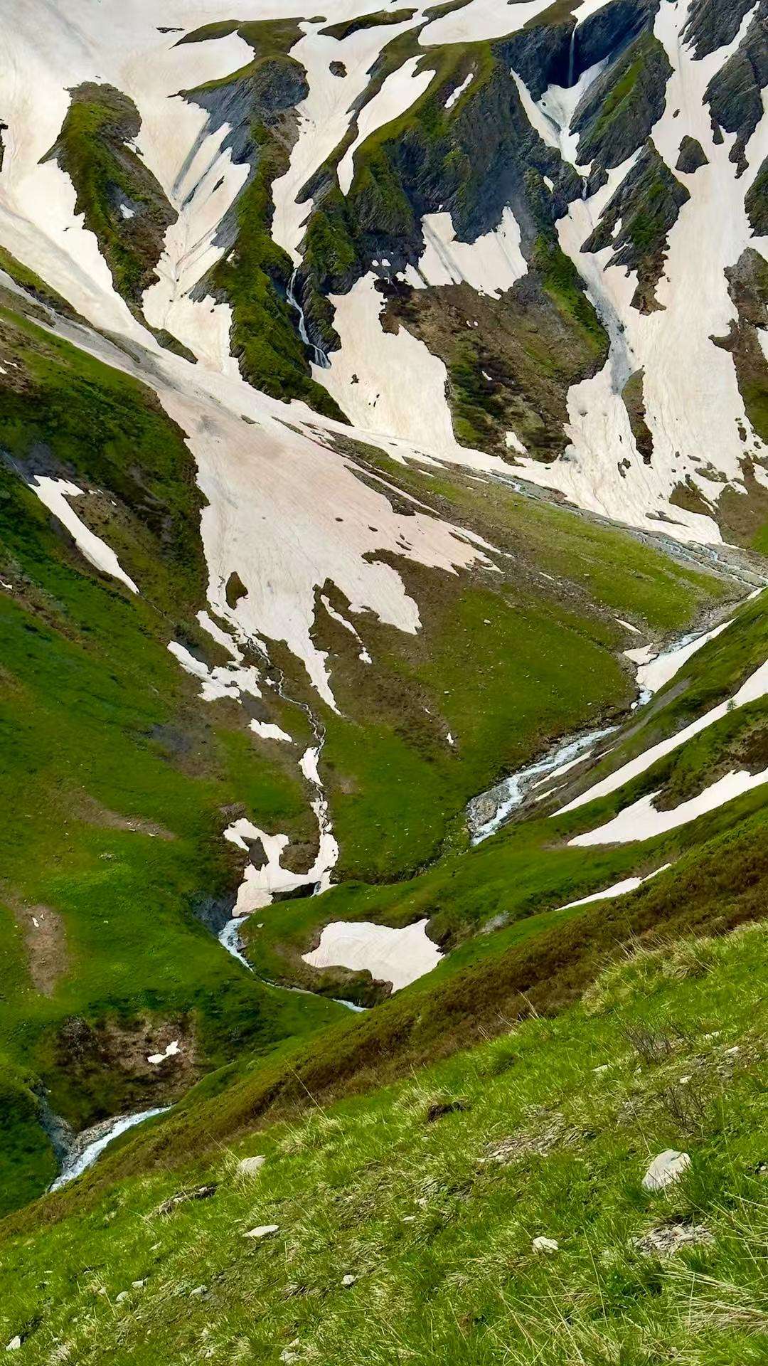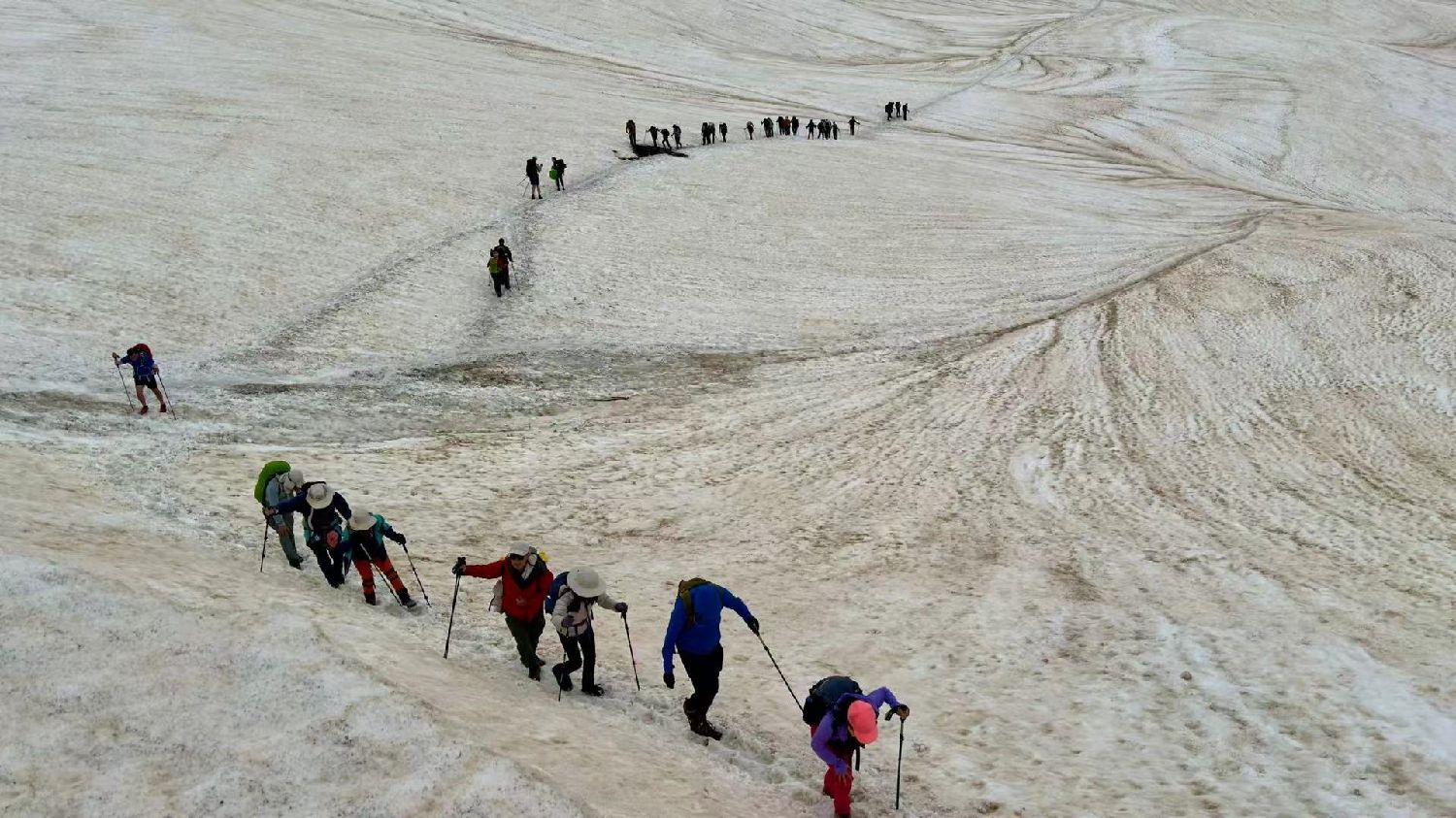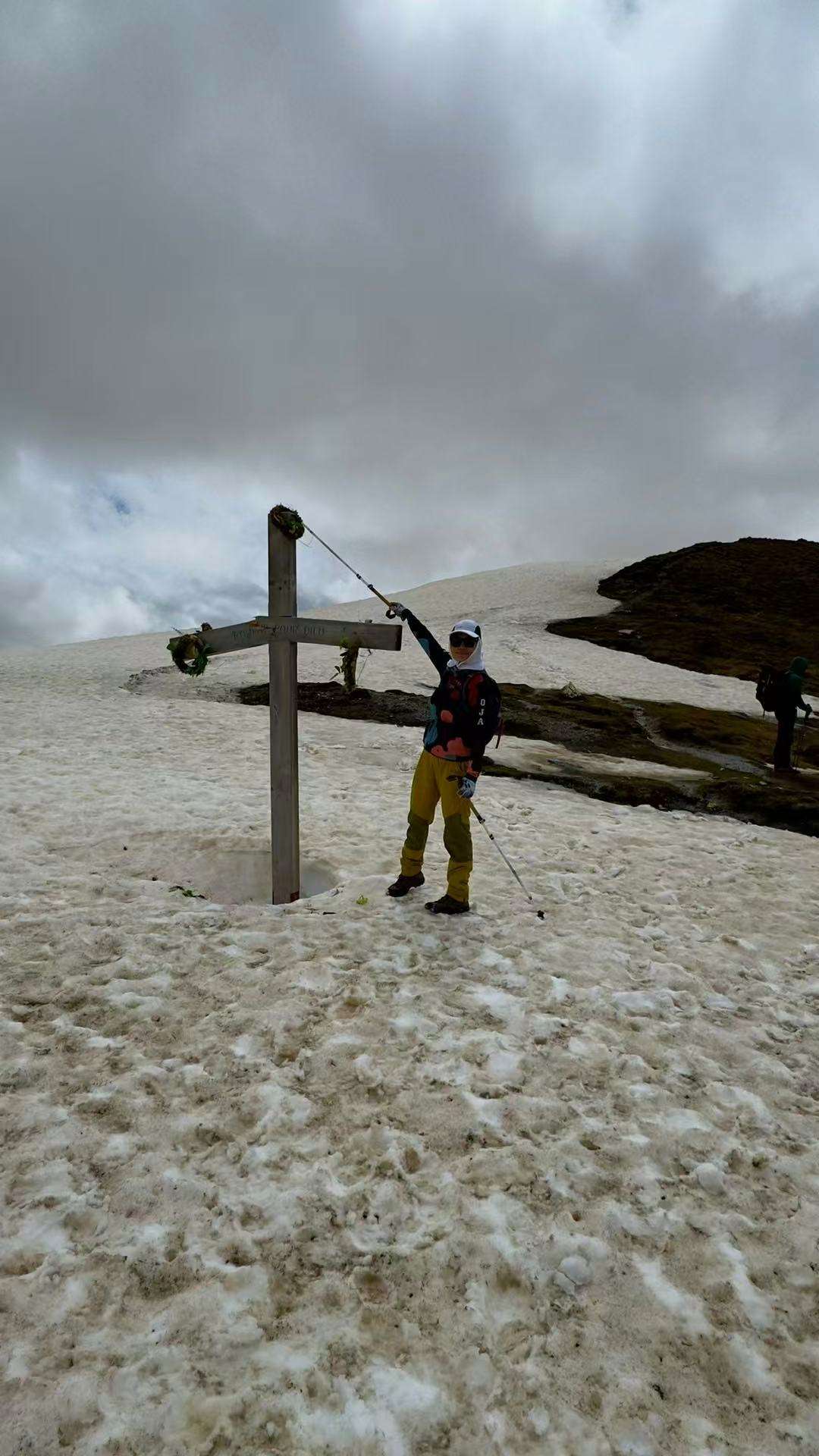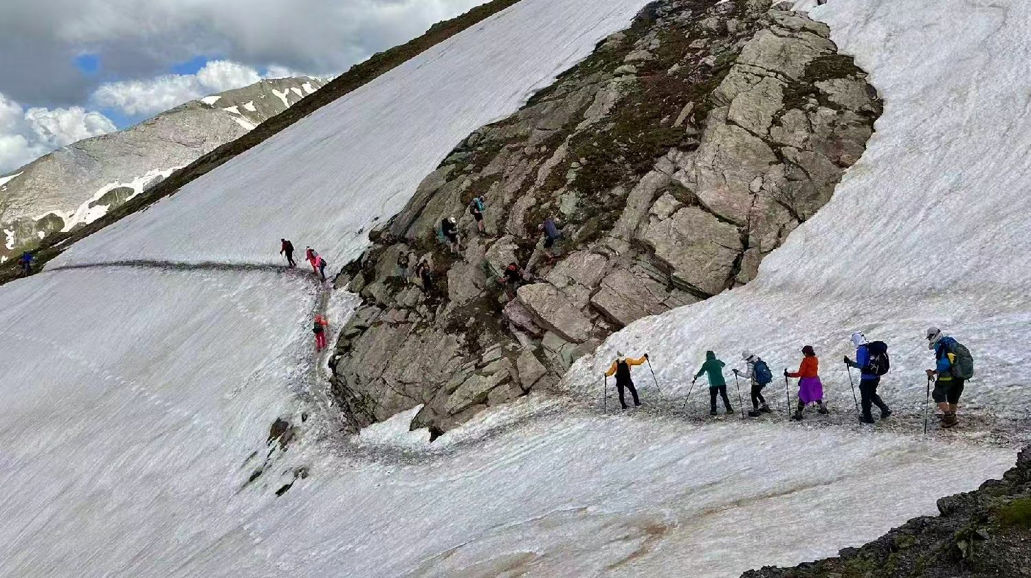 悔之晚矣,走过无数次雪山,同样的雪山场景就横亘在眼前,凭常识、凭本能,这么危险的路段上来时为什么不坚持套上冰爪?那至少会减掉一半危险。我懊悔不已,小心翼翼用登山杖扎在左右两侧,一步一步战战兢兢地前移。