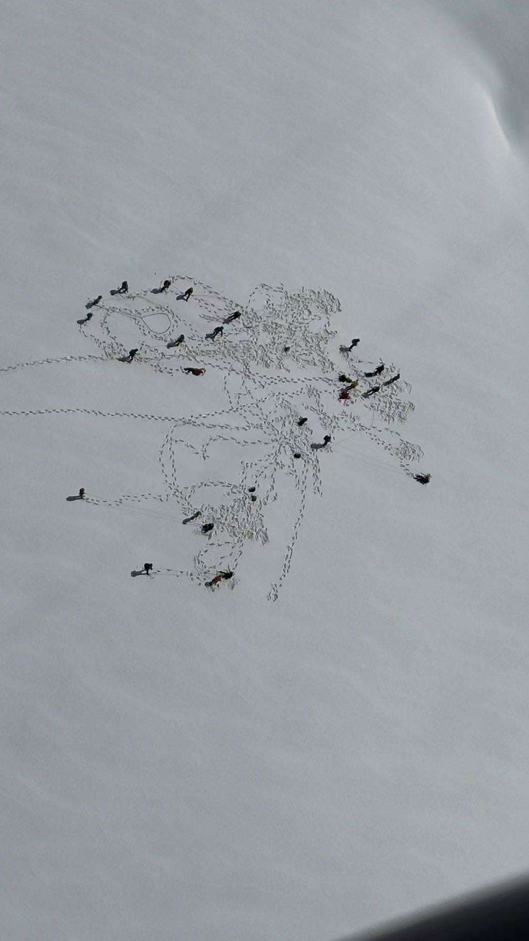 是啊,我们的队伍歪歪斜斜,不见首尾,像一群无头苍蝇般在雪地里胡乱扑腾,看到美景更是鸟散,大呼小叫地各自拍摄去了。有几次看到法兰克与韩国队的法国向导交谈,不知是否在羡慕他的同行,还是抱怨自己所带的这群游马散兵。