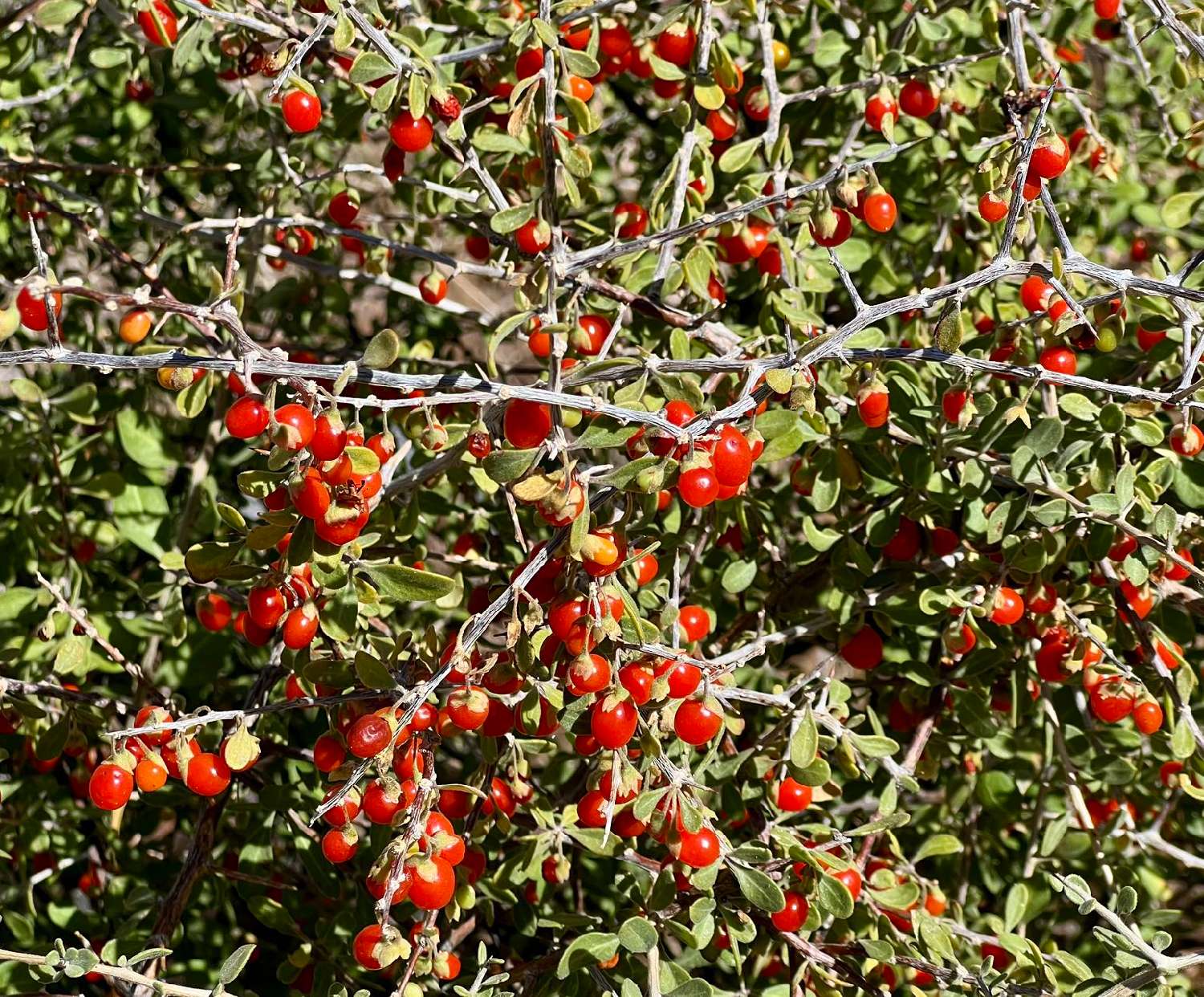 他们介绍的第一种野果名为狼莓,果实非常像中国的枸杞。我记得去年春天去汤姆的拇指爬山时,看到了很多也吃了很多。这些一厘米左右大小的狼莓有圆形有鸡蛋形,有的非常甜,也有些甜中带苦。记得当时怕有副作用,没有敢吃太多。下次遇见一定要饱餐一顿。