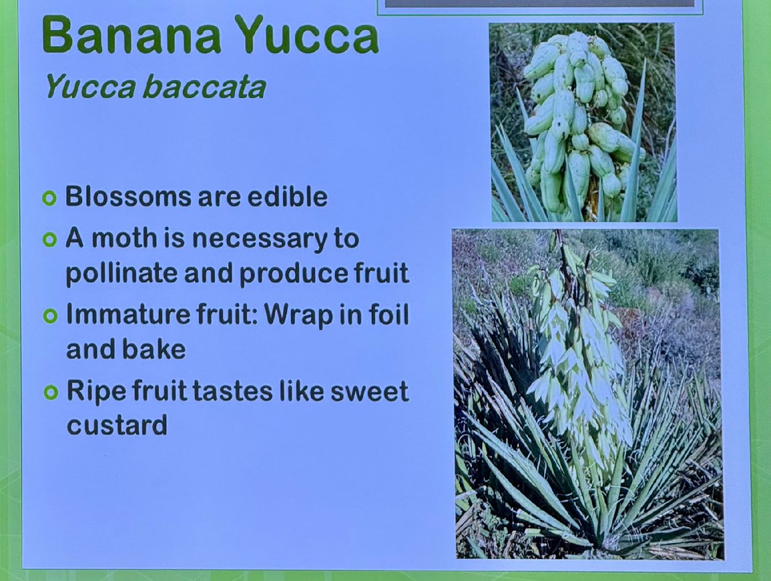 他们还介绍了一种“亚卡香蕉”,这种沙漠仙人香蕉开很好看的可以吃的白花,结的果实非常像香蕉。据说要採绿色的仙人香蕉,拿回来烤了吃,不知道有没有香蕉好吃。我现在想起来我两年前去迷信山东北方徒步时,曾经採到过仙人香蕉,当时害怕中毒,没有敢吃。下次见到,一定带回家烤了尝一尝。