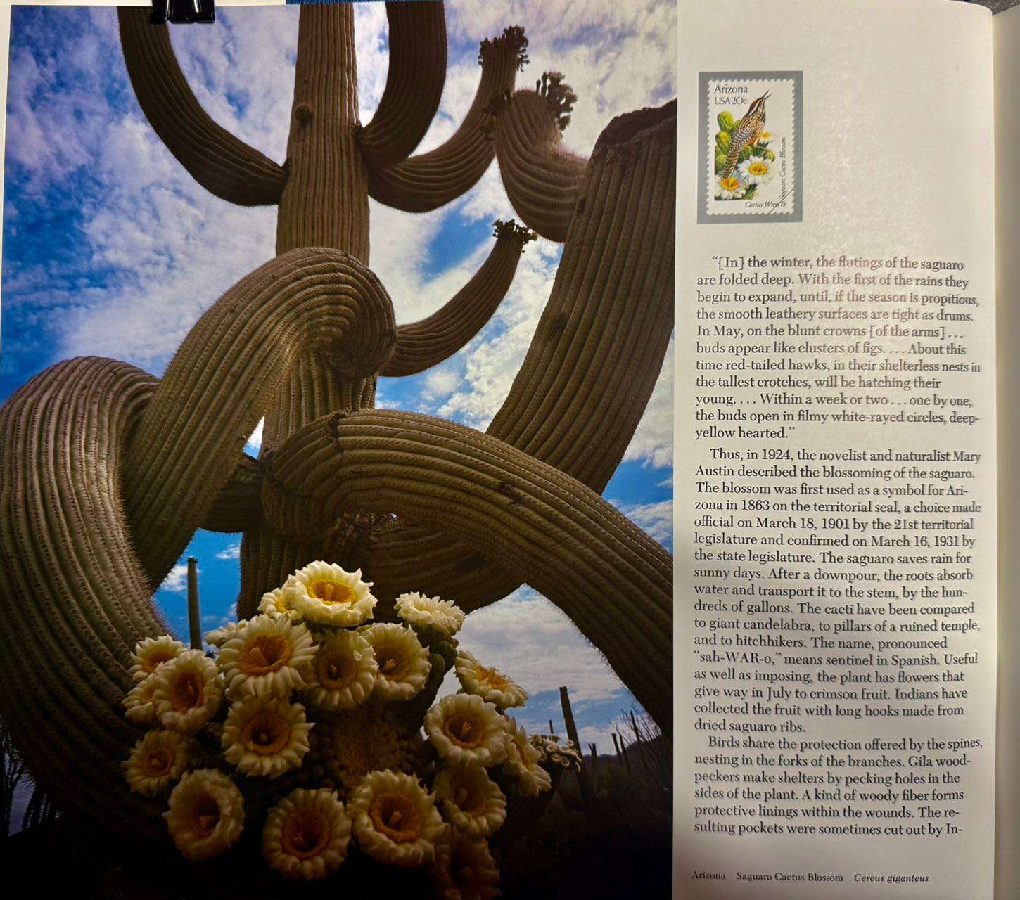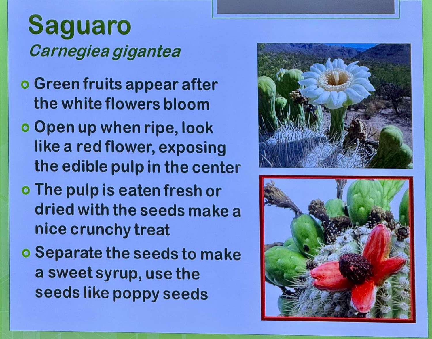 讲座的高潮是介绍我们亚利桑那的州花结的“州果”。州花是白花黄心,开在一种叫 Saguaro (沙瓦若)的仙人树的顶部。我们在亚利桑那爬山时,经常看到成千上万的沙瓦若仙人树。如果季节对了,经常能看到树上的州花。记得不久前我们开车路过一片沙瓦若森林时,看到了有些仙人树上是白花,有些好像是红花。通过这次讲座,我才学到了红颜色的是沙瓦若开花后结的仙人果。据说仙人果的味道非常鲜美,让我想起西游记里的猪八戒吃的仙人果。讲座结束后,我感觉在亚利桑那的二十年一直都没有吃过最美的仙人果,不能不说是人生的一个遗憾。无论如何明年夏天也要当一回猪八戒,饱餐一顿仙人州果。