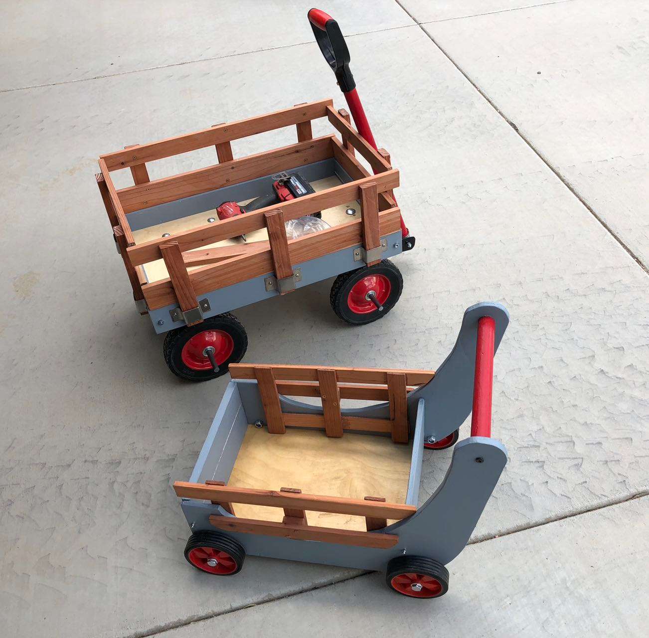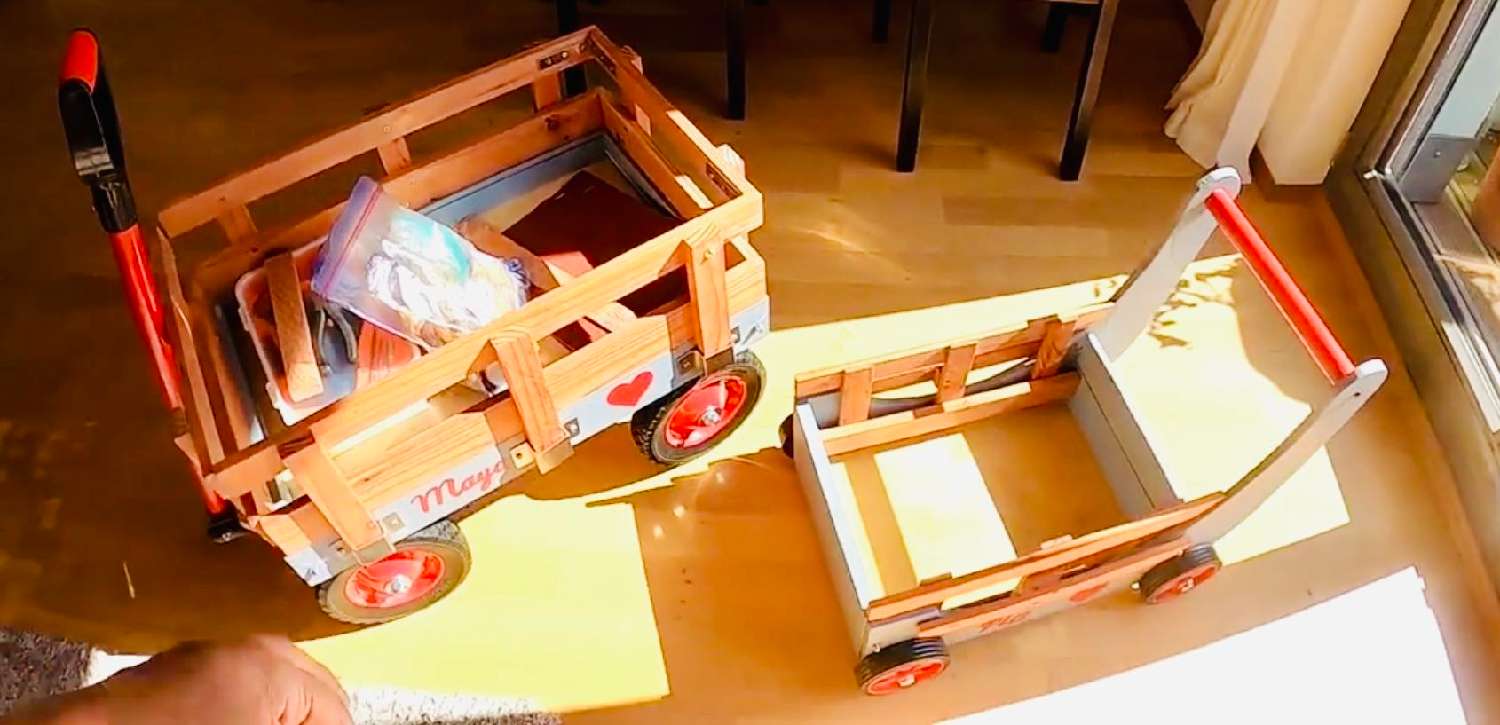 我先生更是高兴得不知如何是好。除了给孙儿们寄钱买礼物,他还亲手为每个孩子打造了一辆木制小推车。我笑他说:“带着两辆木头小车去德国,恐怕是天下最silly的主意吧?”他却一脸认真地回答:“这是按名牌样式设计的,又出自爷爷之手,比什么都珍贵。”于是,我们便带着两个本不该这么沉的大行李箱,装满了拆解后的木条、木板和钢条;又怕行李超重,把八个铁轮子和一袋螺丝钉统统塞进了手提箱里。