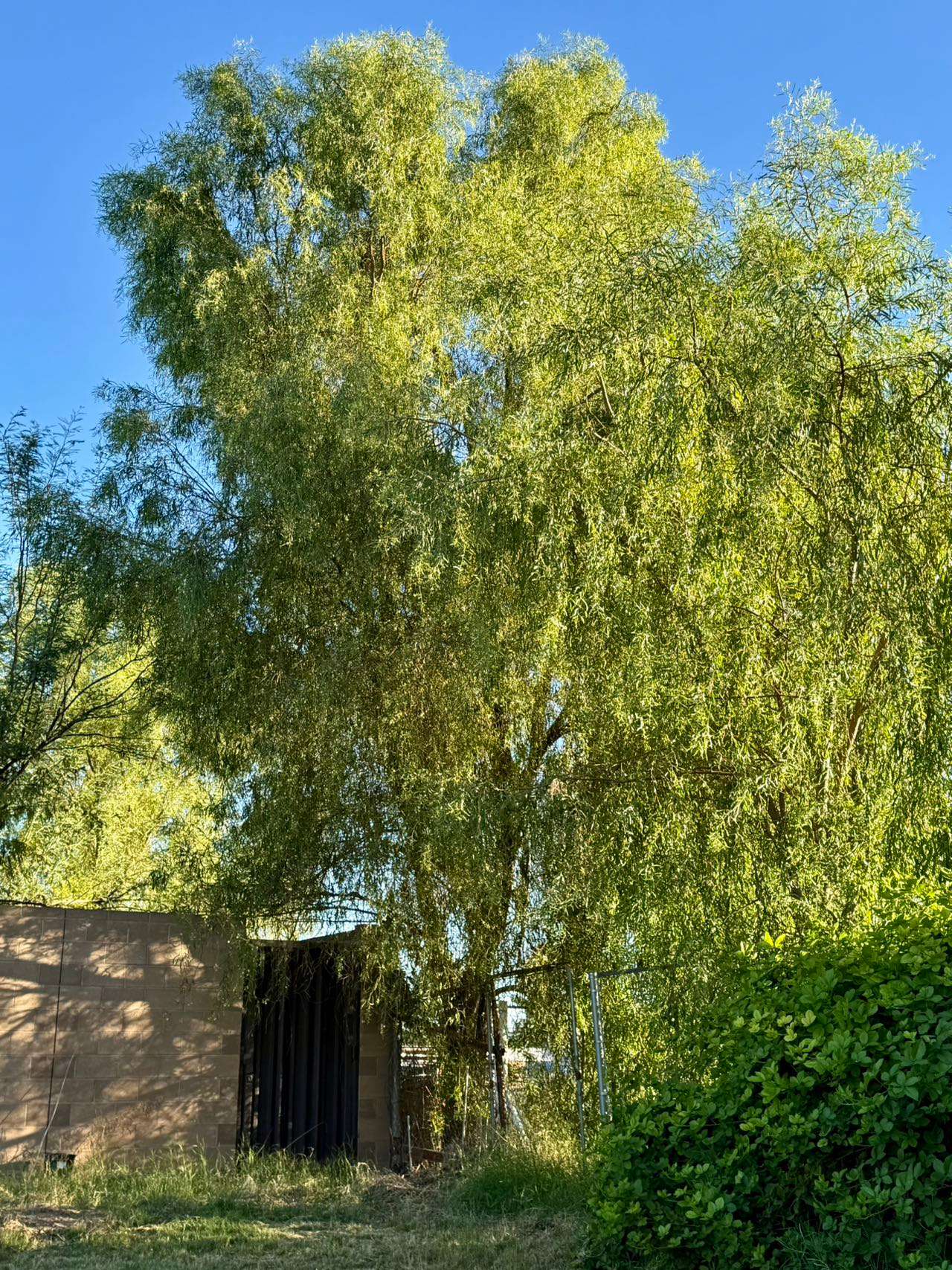 第2头痛的是自生树英文名字叫 Willow Acacia 中文好像叫金合欢(沙柳)。非常耐旱,生命力和生殖力略弱于沙漠扫帚。这种自生树的主要问题是它长得有快又高。几年不管,可以长20多尺高。