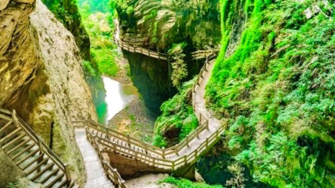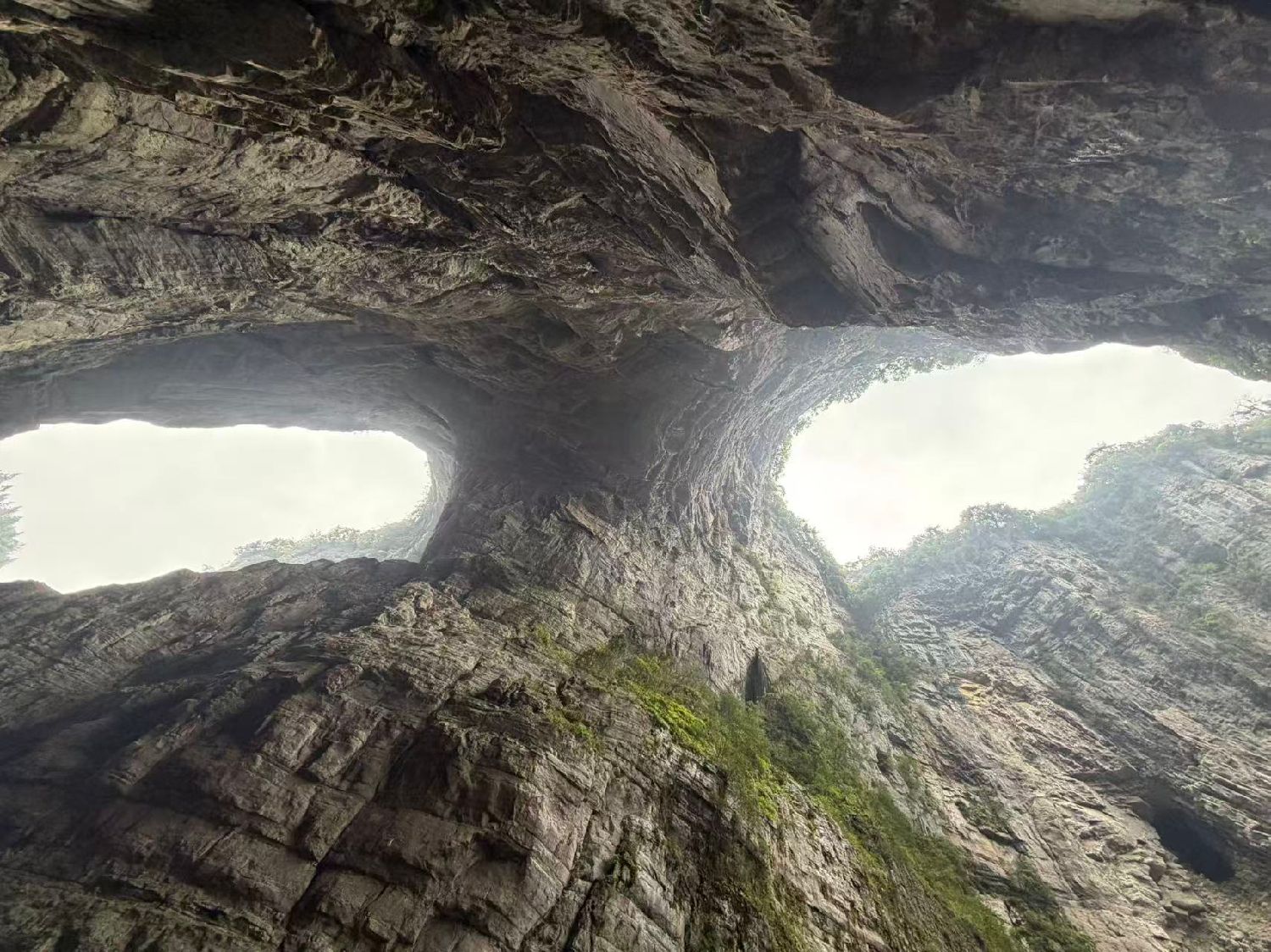 天生的石桥群、巨大的天坑、险峻幽深的地缝。有时一天要走二十余里,上落千级的石阶,对于我们这些出入汽车代步的人,真的累得够呛!脚下丈量着祖国的大好河山。眼睛却望着遥远的电梯,巴不得立即就坐上去,返程回旅店睡觉。