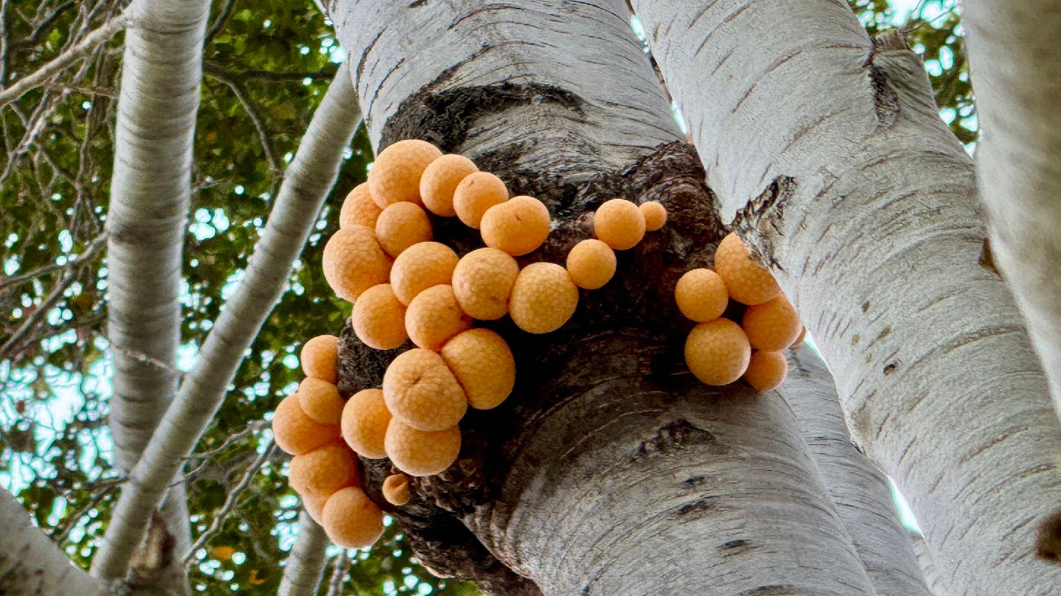 达尔文真菌是一种寄生型真菌,它们主要寄生在山毛榉树上。每到夏季温暖时,它们就会钻进生命旺盛的山毛榉树,然后在树干内吸食植物糖分不断猥琐发育。由于真菌逐渐成长,树干内的韧皮部通道被堵塞,这时树木出于本能会分泌出一种胆汁,使其表层越来越厚,时间一久树干就成为了一个类似蜂窝的巢穴,远远看上去好像偌大的“肿瘤一样”。