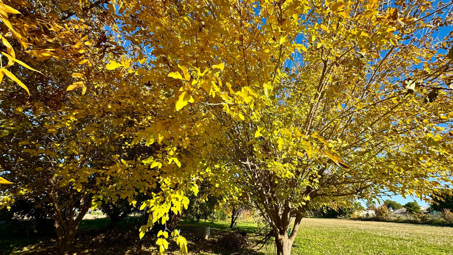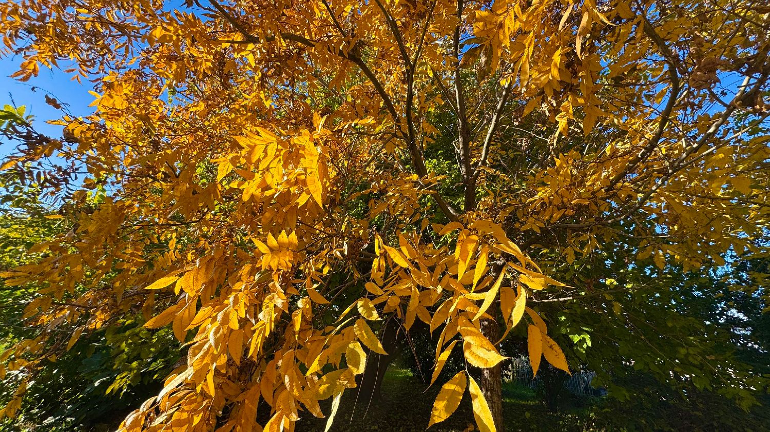 美国山核桃树叶舒展而垂落,叶脉如行云流水,线条温润而从容。金黄、橙褐与尚未褪尽的绿在枝头交织,层层叠叠,仿佛被秋光轻轻点染。阳光穿过叶隙,色彩在明暗之间流转,既热烈又安静。微风拂过,叶片轻轻相触,整棵树像是在用色彩书写季节的诗行。
