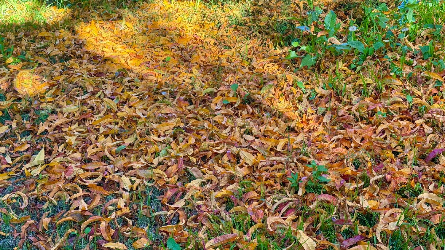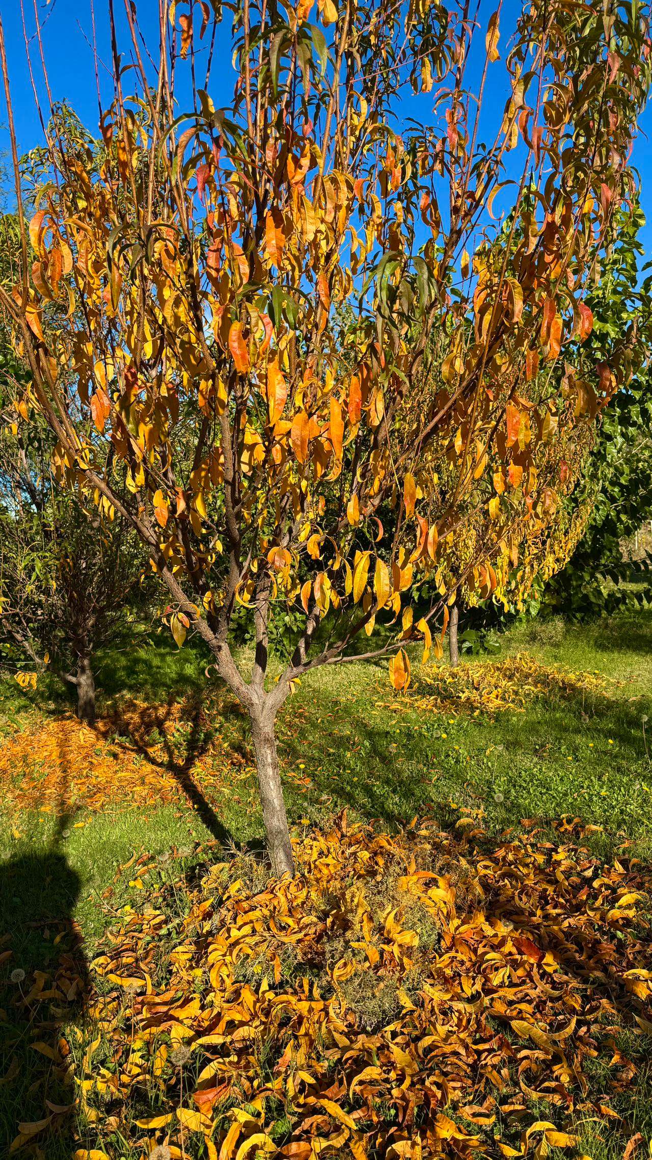 橙黄间杂着青绿的桃叶,在湛蓝的天空与柔软的青草之间,悄然分割着秋的光影。一半仍依恋枝头,随风轻轻摇曳;一半已归于大地,安静地伏在草间,仿佛完成了一场季节的迁徙。树上是未尽的告别,草间是温柔的歇息,秋色因此而平衡。
