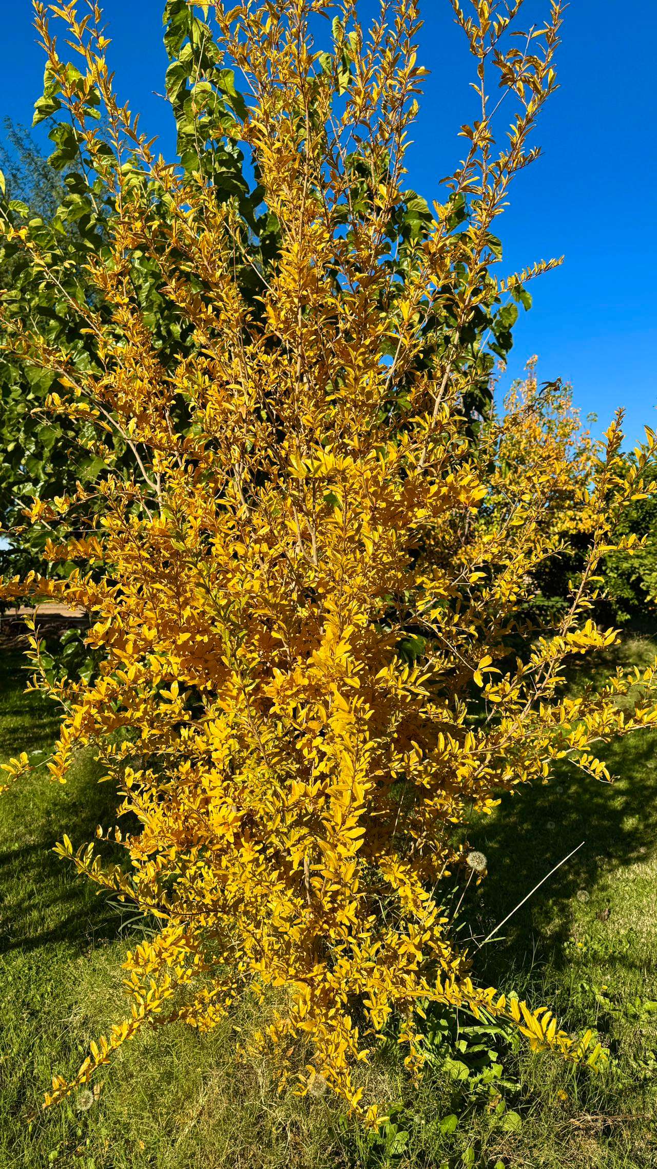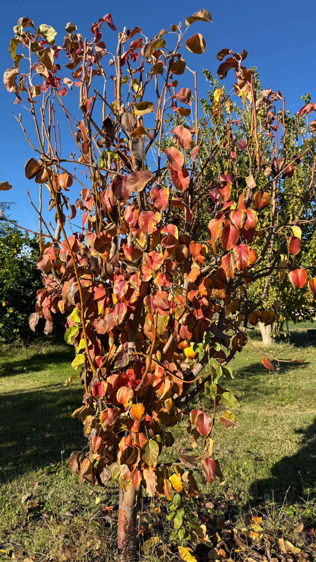 鸭梨树已在园中生长四年,而这样的秋色却仿佛初次相逢。橢圆形的叶片在枝头悄然展开,一片叶子里竟藏着两重色彩——橙红自叶心缓缓晕染,边缘却泛起温柔的金黄,如同秋阳在叶缘轻轻停驻。