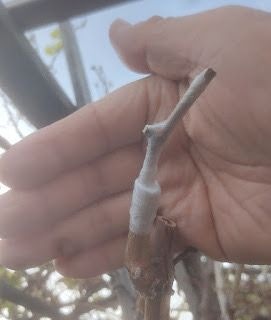 2025年,我用买的PE材质嫁接带,嫁接了几个葡萄接穗,没有一个最终活下来。有两种原因,用这种材质没有捆绑够密封,另一个原因是葡萄砧木出现肥料中毒,母藤自身都快要活不成,更难保证嫁接的接穗能够活下来。因此,今年在另一棵健康的葡萄上进行实验,做了10个接穗的嫁接。能否成活,只能拭目以待到春天;能否成功,得耐心等待夏天的到来。