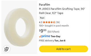 第一种:parafilm,比较宽,需要对半剪开用。用起来的感觉是parafilm偏软,要拉扯比较紧,会有一定的难度。好处是可以拉长很薄,有利于密封住嫁接口。