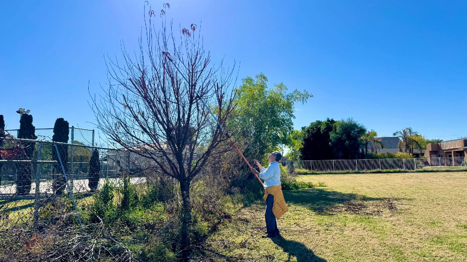 那些又细又高的枝条,他通常用伸缩式高枝剪 / 高枝锯(Extendable Tree Pruner and Pole Saw)。这玩意儿本身就有十尺长,还能再拉长,又沉又费力。我连举都举不起来,更别说用了。领导用一会儿,就得停下来歇一歇才能继续。