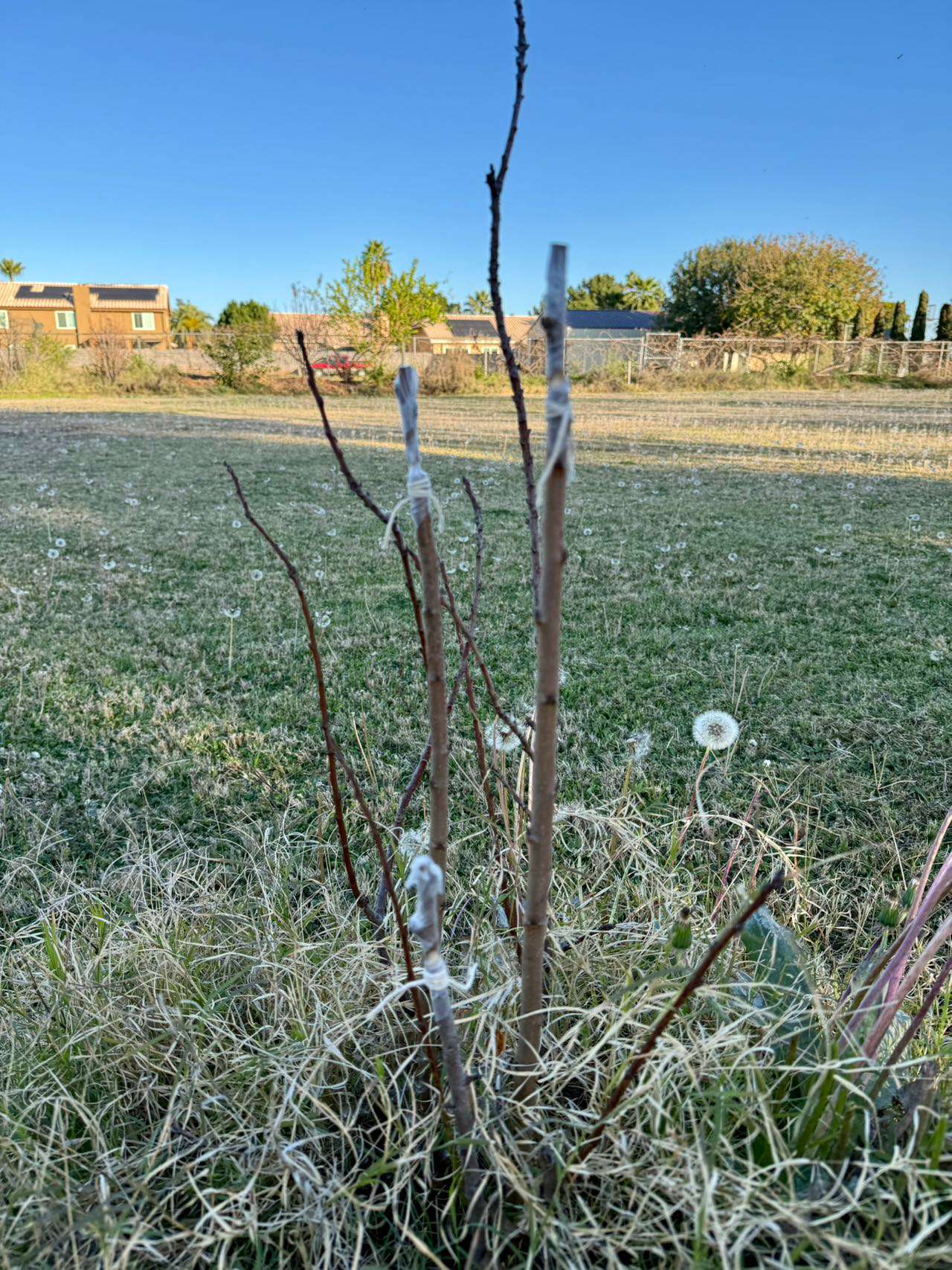 嫁接:每年我们都会嫁接一些我们喜欢的果树品种。比如去年我们成功地嫁接了一种很好吃的卡若卡若橘子。今年又嫁接了杏树和白桃,还有葡萄和甘蔗甜枣。一般在一棵树上我们会嫁接三个枝条,这样只要有一处成功,我们就可以给树改命了。