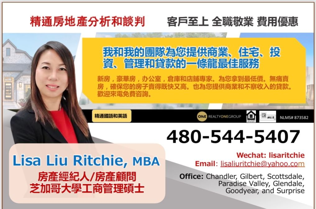 如果您想了解更多商业和住宅房地产市场和房源,请电话亚利桑那州千万资深房地产专家Lisa Liu Ritchie480-544-5407!