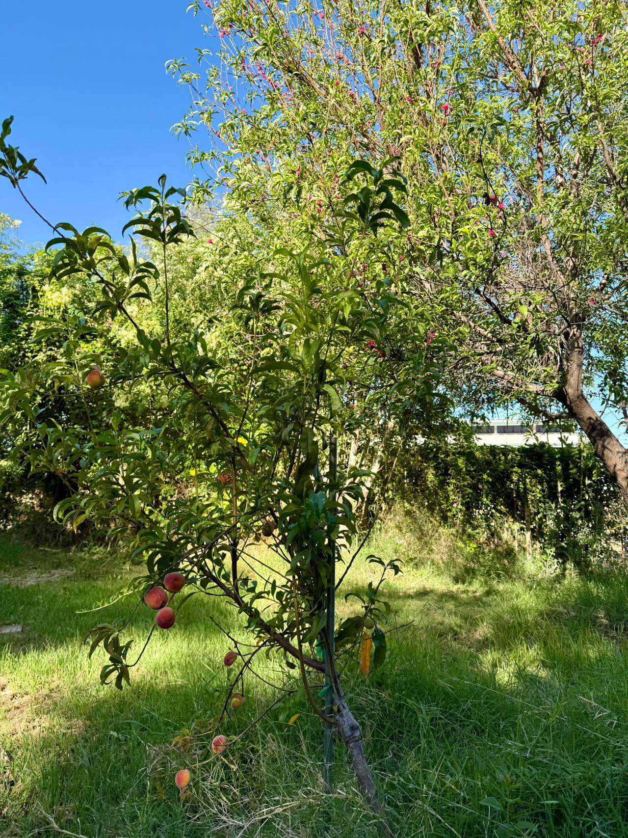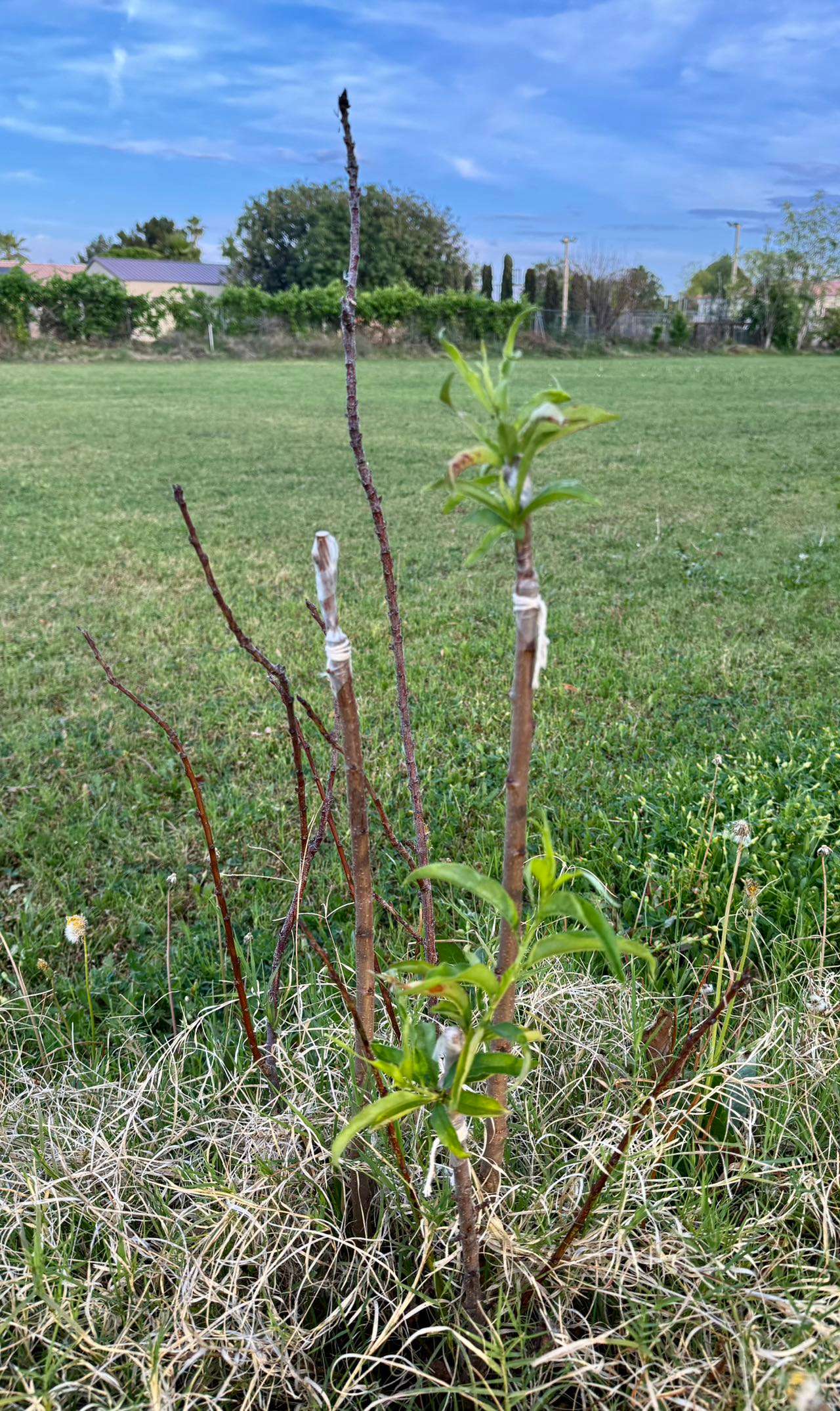 四月的第一个惊喜是发现两个月前嫁接的9株白桃树苗居然大部分都成功了。说起来这些桃树苗还有一些故事呢。大概十多年前,我们在院子里种了一棵开红花的七月桃树。春天开很好看的红花,七月结一些味道非常浓郁的桃子,有些桃子最大会有半斤。这棵桃树在和另外一棵棕榈树的争斗中窜出来了好多嫁接母本。过去好几年我们在清理这些窜出来的母本时都把这些树苗带根移栽到了院子里的其它地方。过去这些年陆陆续续移活了好几处。以前曾经在两处移活的母本上嫁接了春天的桃子品种。去年和今年这些嫁接的桃树都结了一些小桃子。今年嫁接的白桃品种非常好,嫁接枝条是从我们院子里白桃树上剪下来的。现在可以梦想大概三到五年后,我们会吃到很多水蜜白桃。