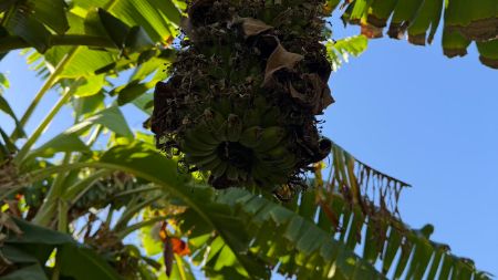 再有一个惊喜就是去年冬天天气非常暖和,我们的正在结果的香蕉安全的过了冬天。非常期待几个月后可以吃到自己种出来的香蕉。杨桃树正在开花,什么时候能吃到杨桃呢?