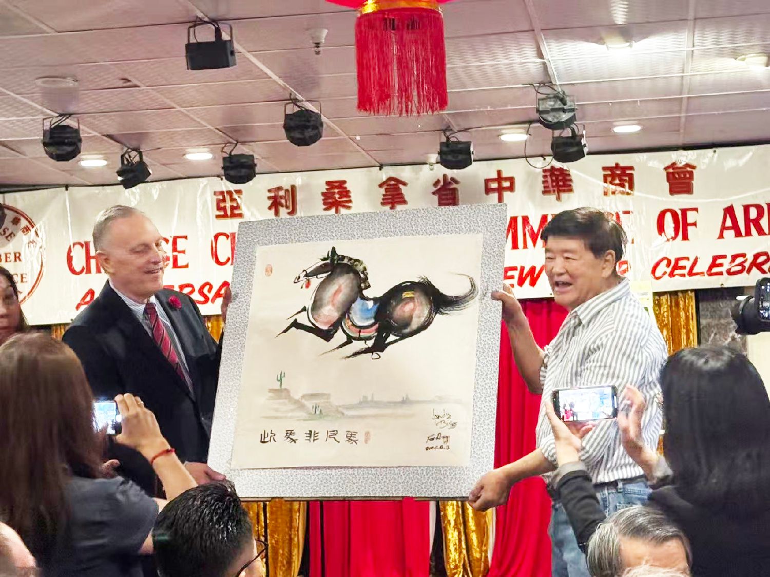 联邦众议员、州长候选人Andy Biggs应邀出席了春宴,并发表了演说。他还在画家范融的“骏马奔腾“的画作上,“画龙点睛”,妙笔生花,完成了最后一笔,留下了他们妙趣横生的一段佳话。
