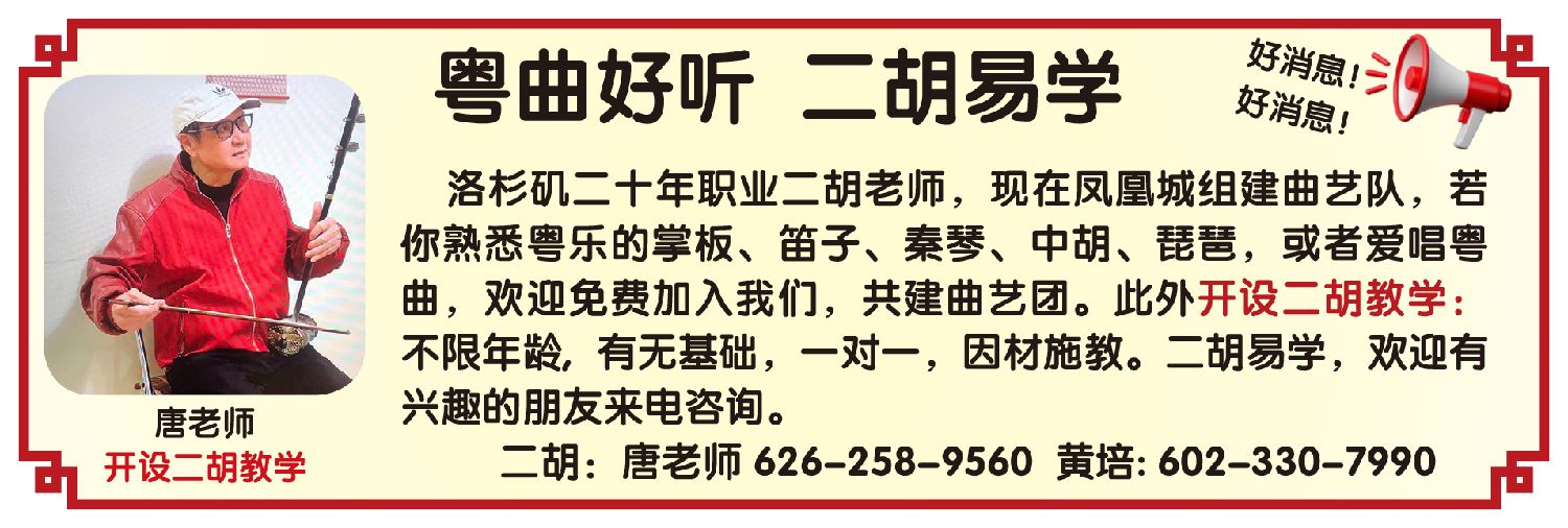 洛杉矶二十年职业二胡老师,现在凤凰城组建曲艺队,若你熟悉粤乐的掌板、笛子、秦琴、中胡、琵琶,或者爱唱粤曲,欢迎免费加入我们,共建曲艺团。此外开设二胡教学:不限年龄,有无基础,一对一,因材施教。二胡易学,欢迎有兴趣的朋友来电咨询。