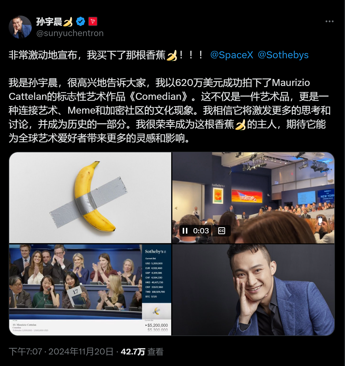 孙宇晨在一份声明中表示,这件作品“代表了一种连接艺术、表情包和加密货币社区的文化现象”。但他表示,最新版本的“喜剧演员”不会持续太久。