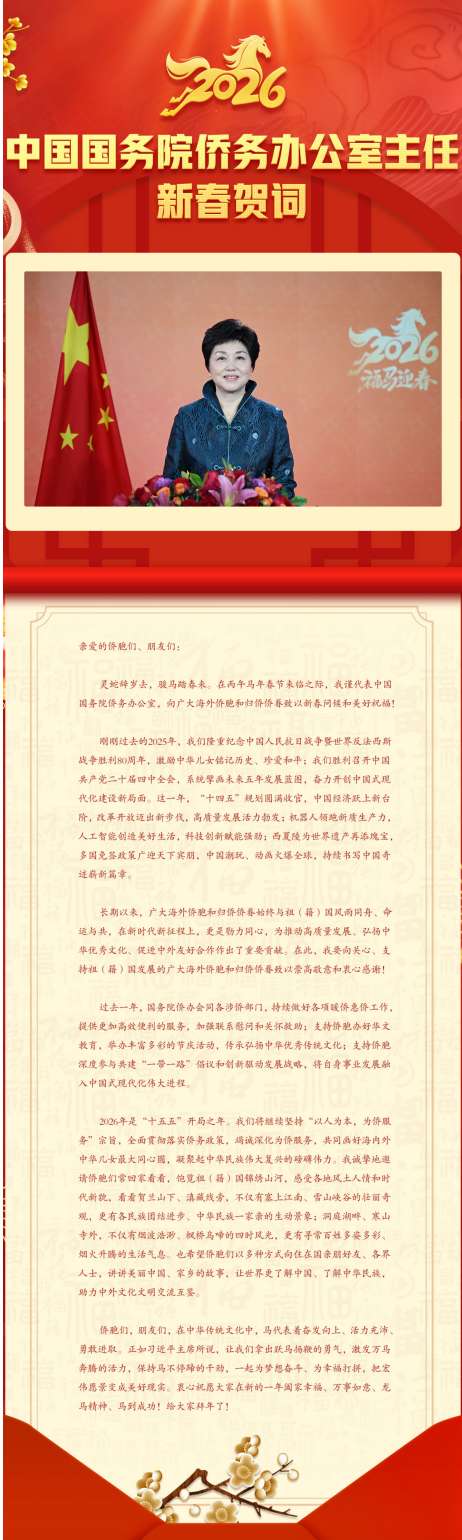 【视频】中国国务院侨务办公室主任陈旭发布2026年新春贺词