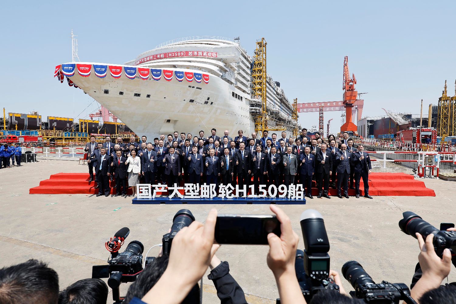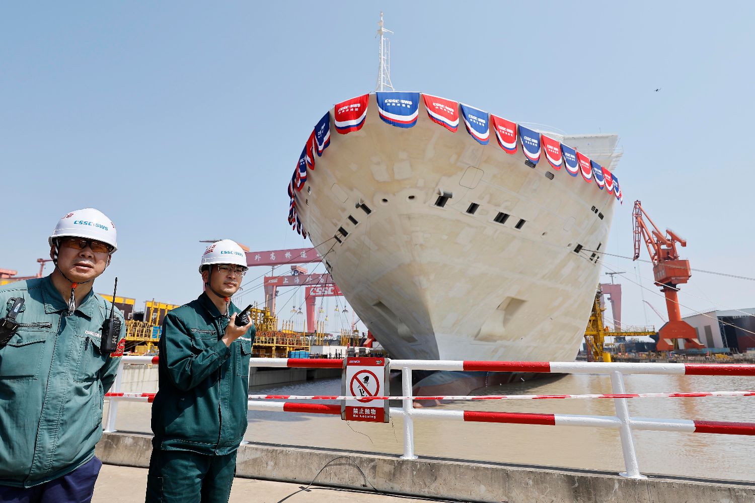 第二艘中国国产大型邮轮“爱达·花城号”实现坞内起浮。(图片来源:中新社)
