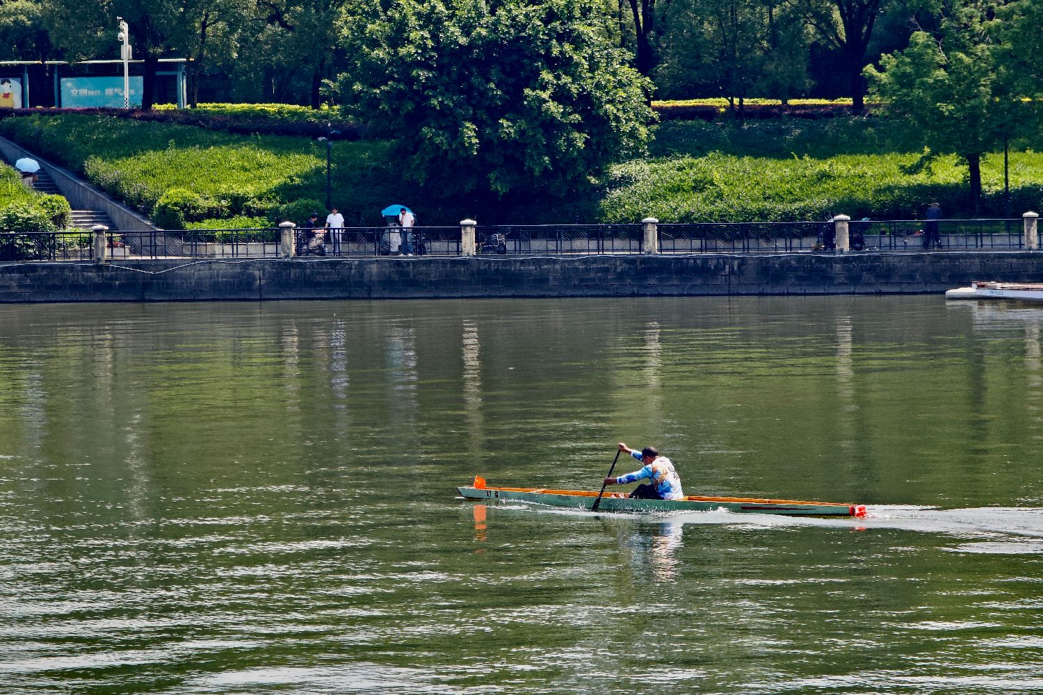 民众在龙舟池划单人龙舟。(图片来源:中新社)