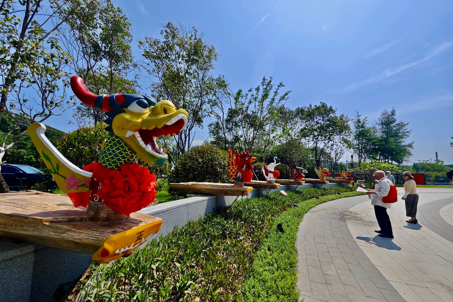 民众观看各种动物造型的龙舟首。(图片来源:中新社)
