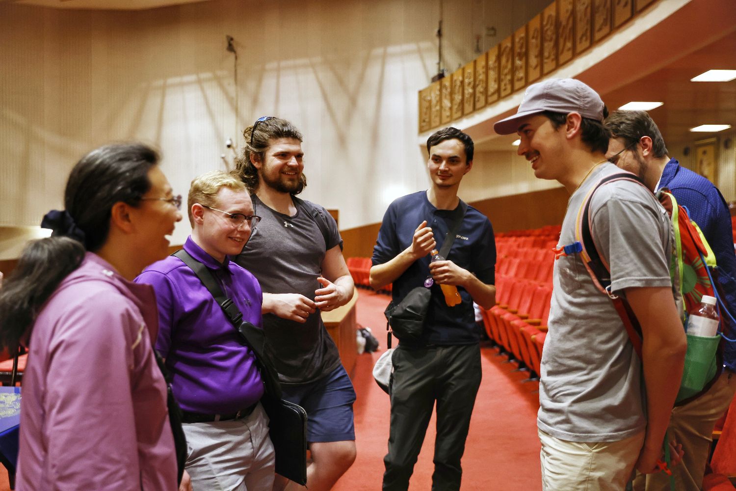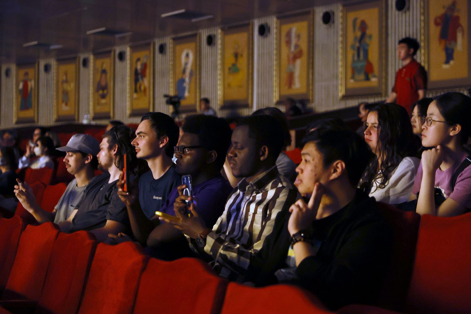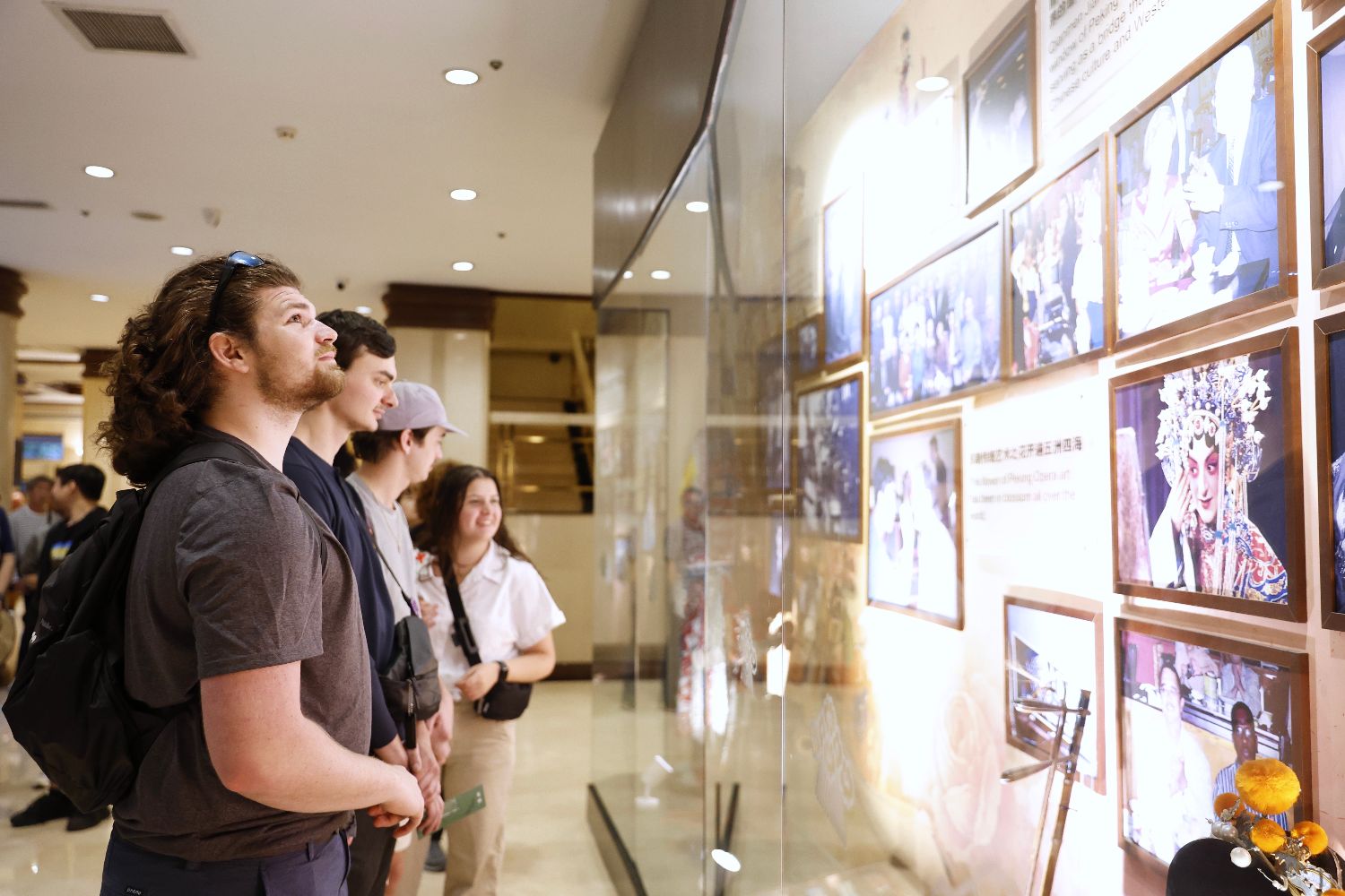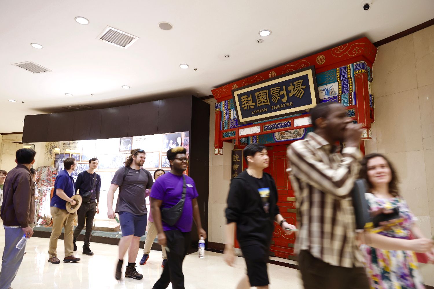参加北京工业大学暑期语言文化项目的美国西卡罗莱纳大学学生23日晚走进北京梨园剧场,观看京剧传统剧目《盗库银》。