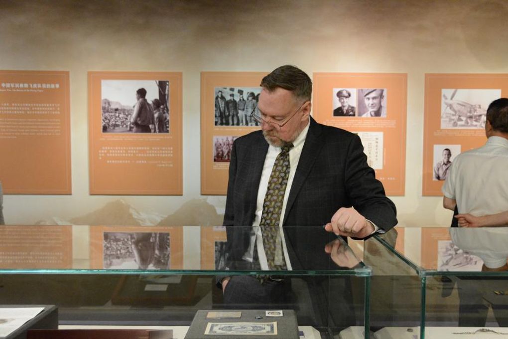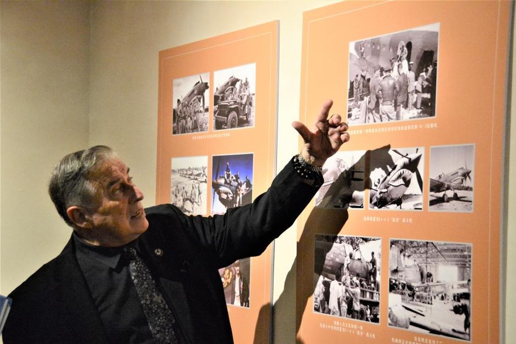 美中航空遗产基金会主席杰弗里·格林在参观“铭记英雄——飞虎队主题历史图片展”。(图片来源:新华社)