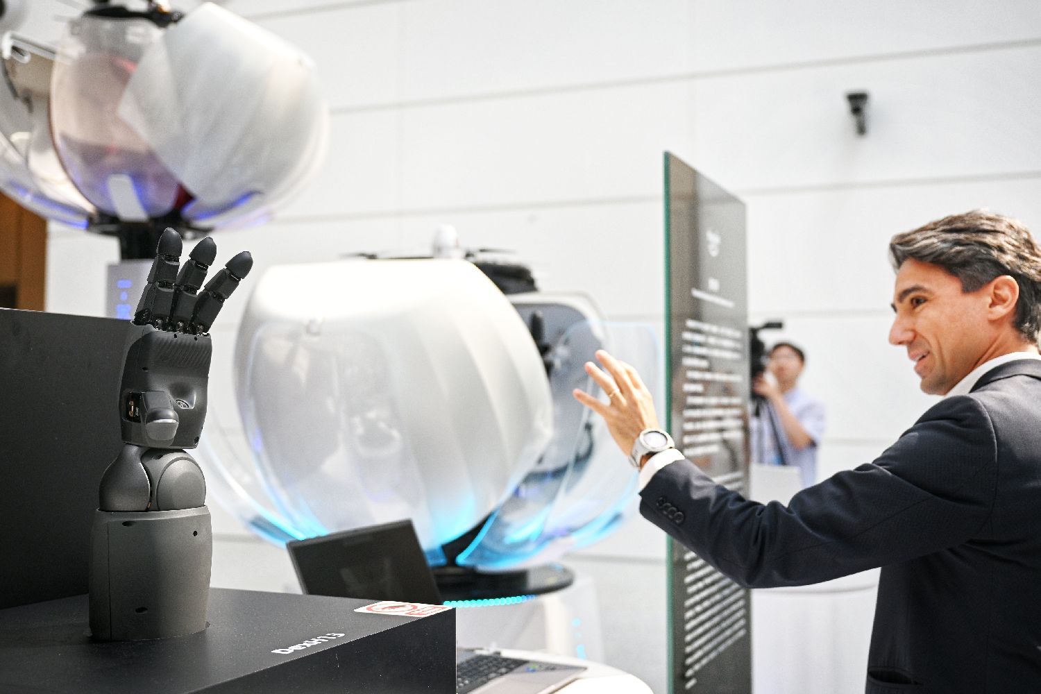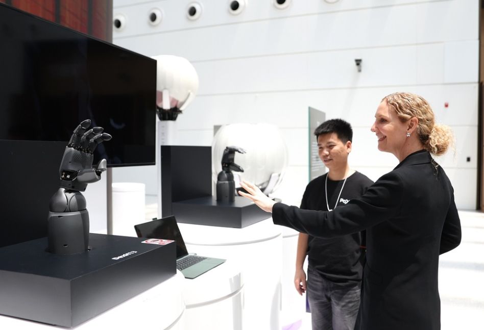 参会嘉宾24日与“多维触觉+AI视觉”双模态灵巧手互动。(图片来源:中新社)