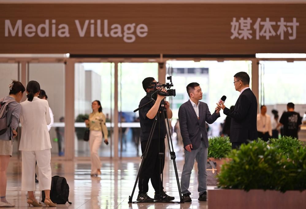 在国家会展中心(天津),记者24日在媒体村外采访嘉宾。(图片来源:新华社)