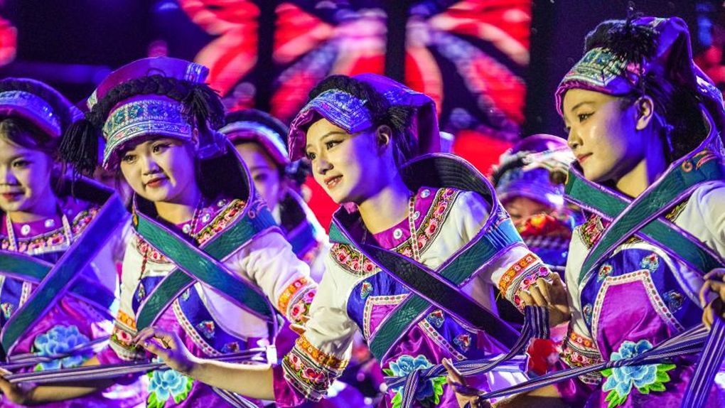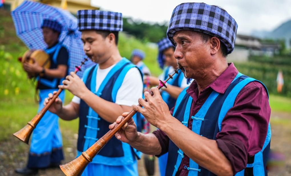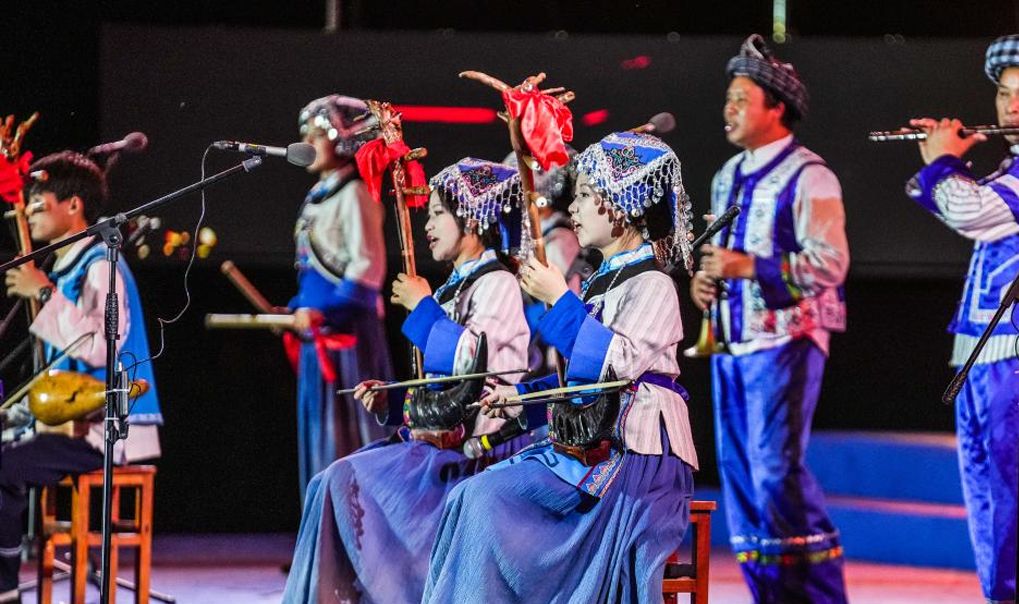 黔西南布依族苗族自治州的布依族民众在表演《八音坐唱》(6月29日摄)。
