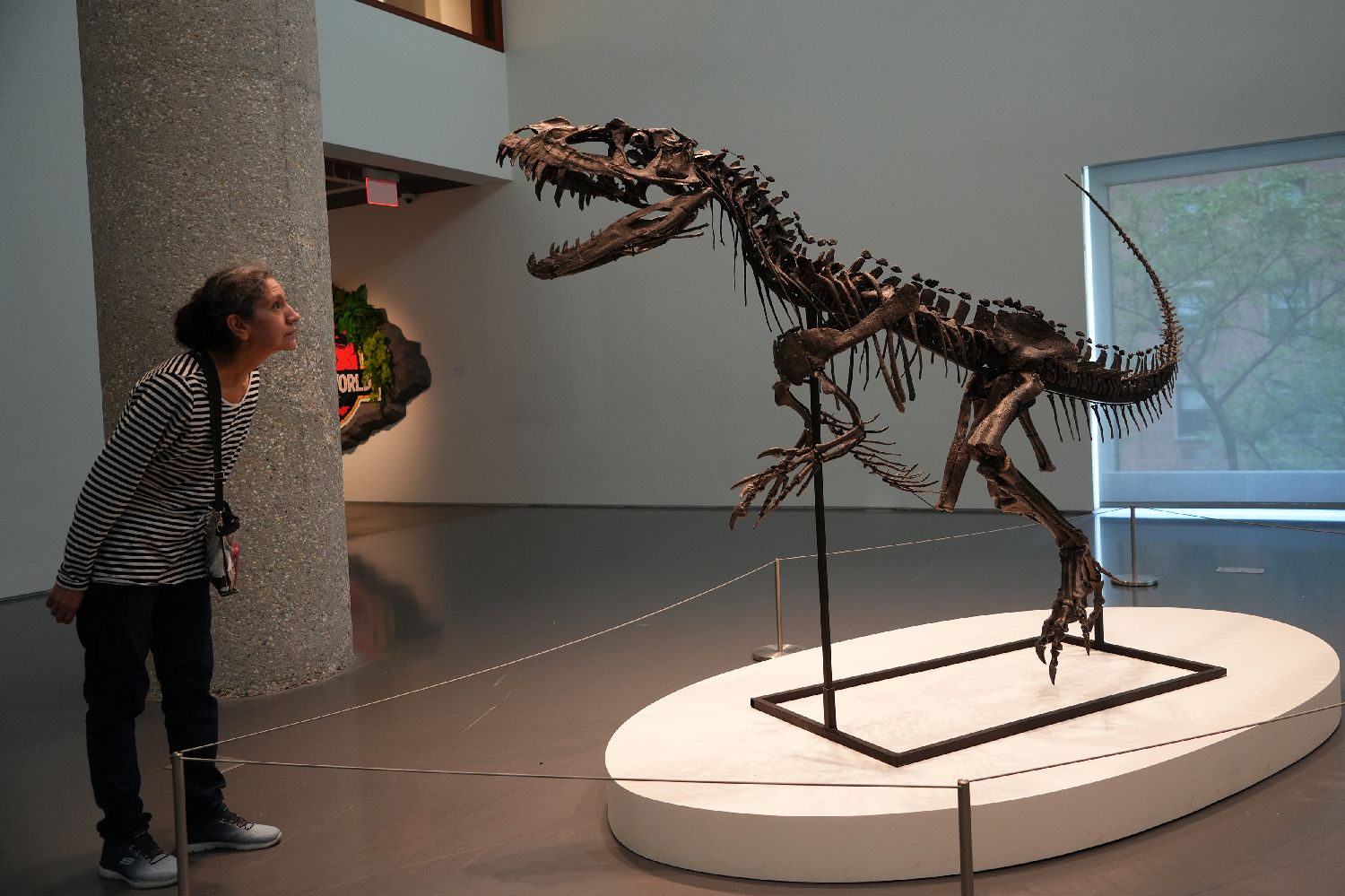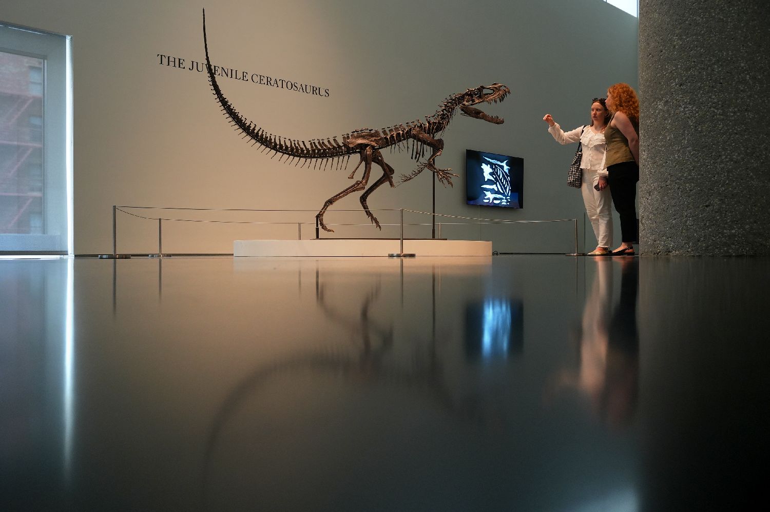 角鼻龙是生活于晚侏罗世的中大型兽脚类恐龙,其体长约5至7米。这种恐龙前肢较短,外形与霸王龙相似,但体型相对较小。图为一具珍稀的幼年角鼻龙骨骼化石15日在纽约苏富比拍卖行进行拍前展览。