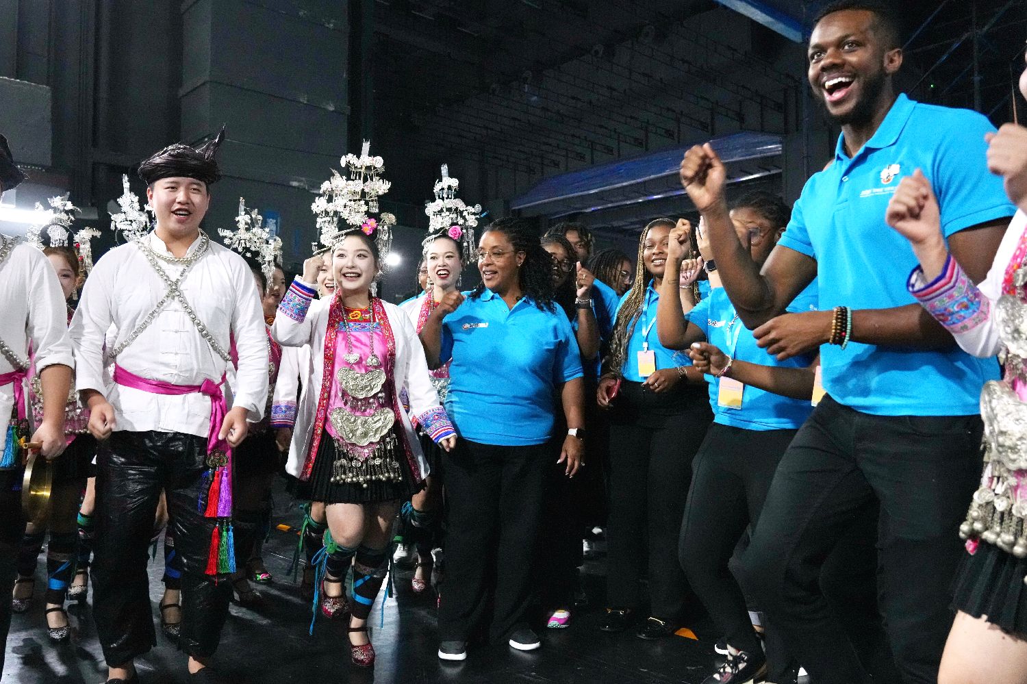 贵州省黎平县侗族大歌合唱团和PureNHeart合唱团一起用侗族的加油仪式互相加油。