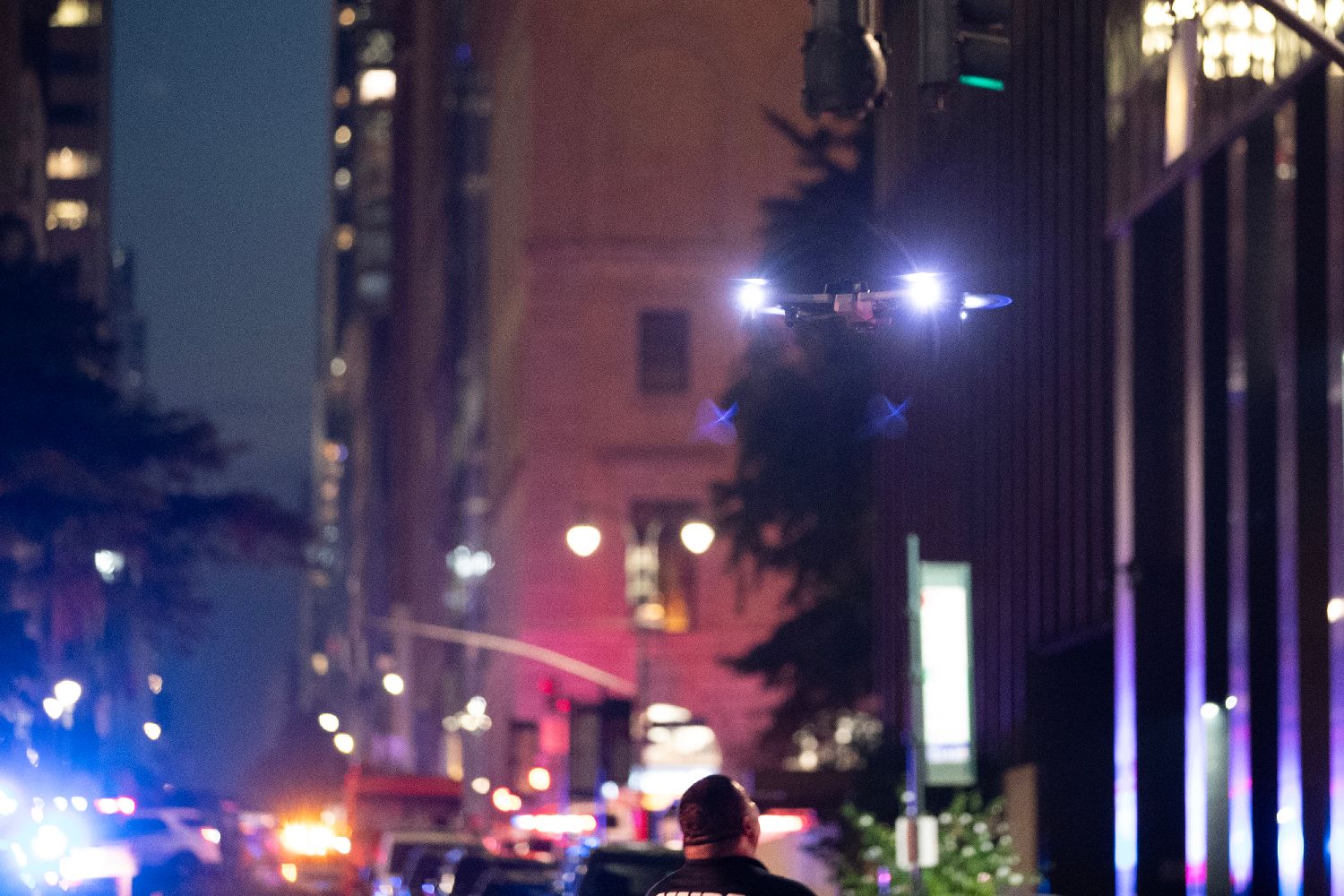 据当地媒体报道,枪手名为沙恩·田村,27岁,携带一支步枪进入公园大道345号大楼,在美国东部时间18时30分许开始射击,然后通过电梯进入大楼第33层,并在那里开枪自杀。图为警方无人机在枪击事件附近楼宇间侦查。