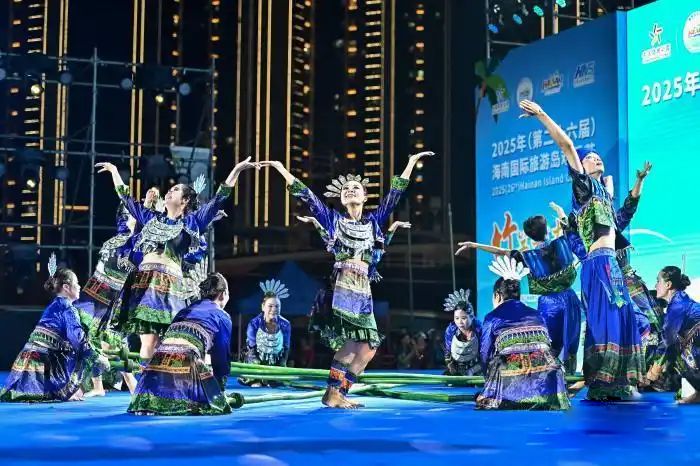 23日晚,2025年海南国际旅游岛欢乐节竹竿舞大赛在海口举行。海南省内16支参赛队与来自云南、贵州、广西的3支表演队同台献艺,为现场数千名观众呈现一场融合民族风情与现代活力的文化盛宴。