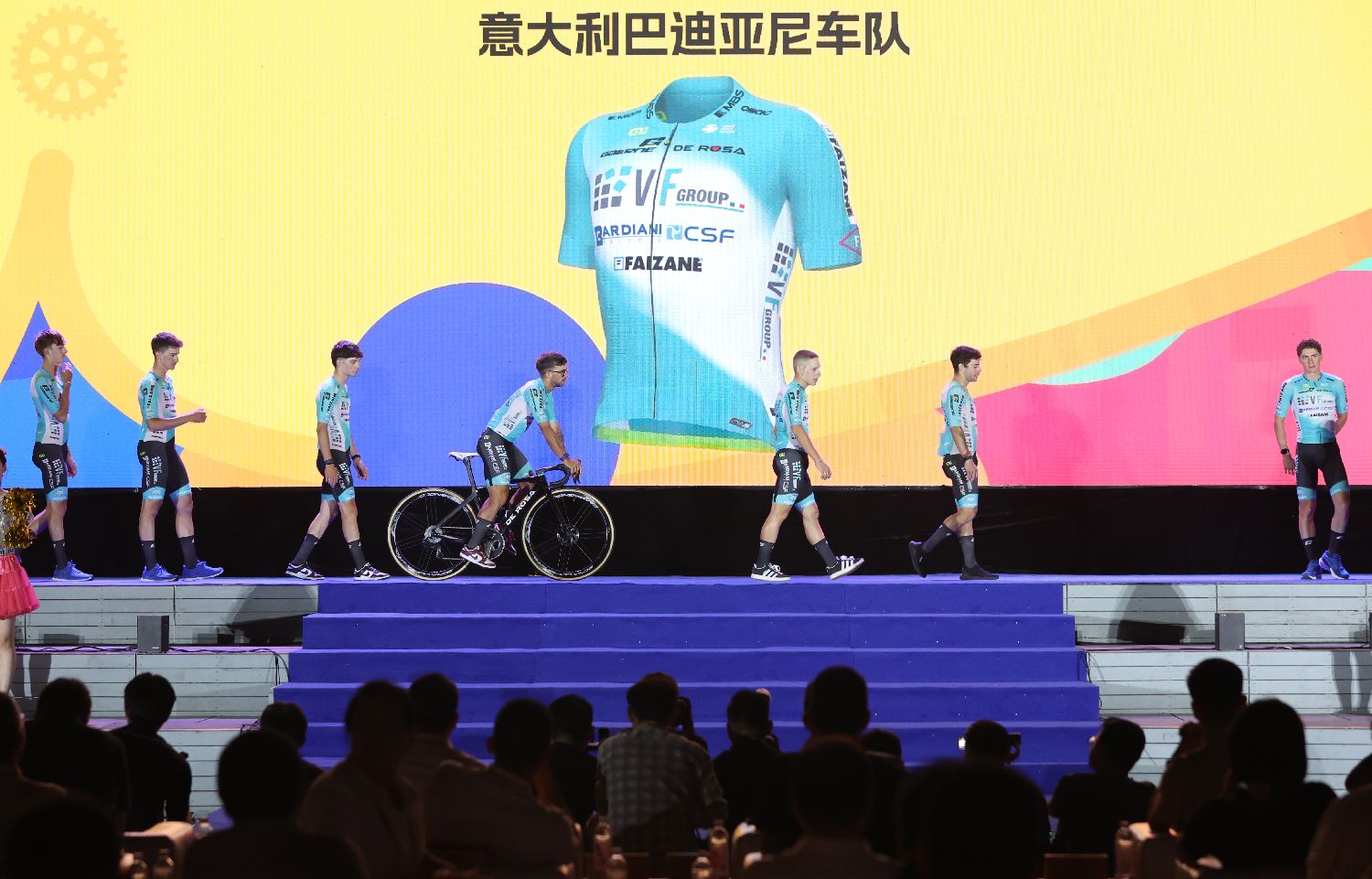 2025第十三届环太湖国际公路自行车赛暨长三角穿越赛8日晚在南京举行开幕式,来自海内外22支专业车队的车手们集体亮相,他们将在专业赛道上展开激烈角逐。图为意大利巴迪亚尼车队的车手们登台亮相。