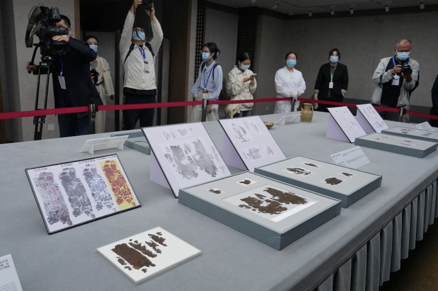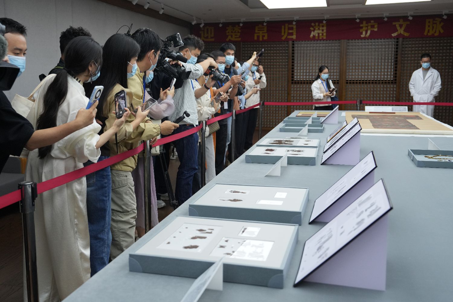 媒体记者拍摄长沙子弹库战国帛书。